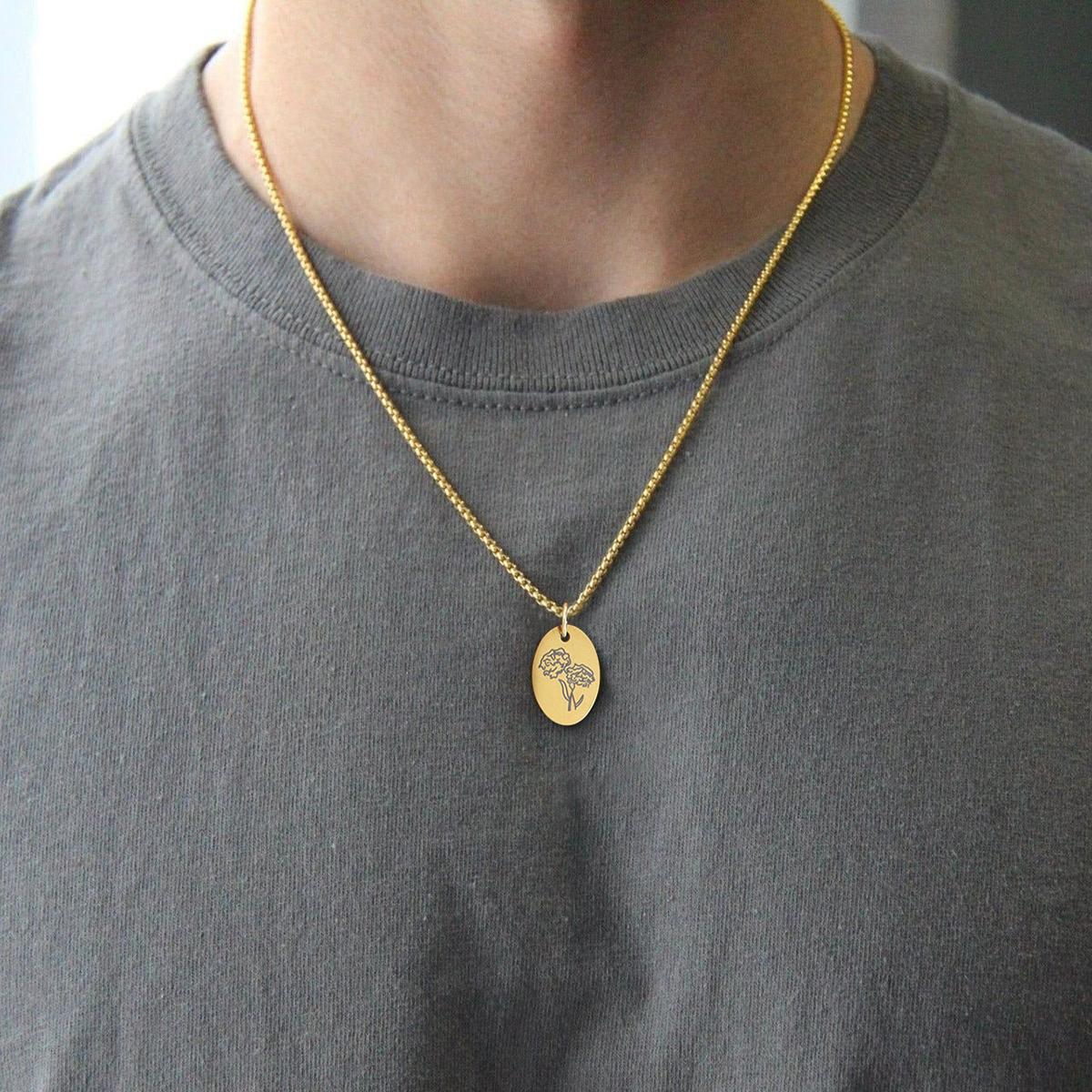 Style: Minimal round medallion pendant with delicate flower engraving, paired with a sleek gold chain