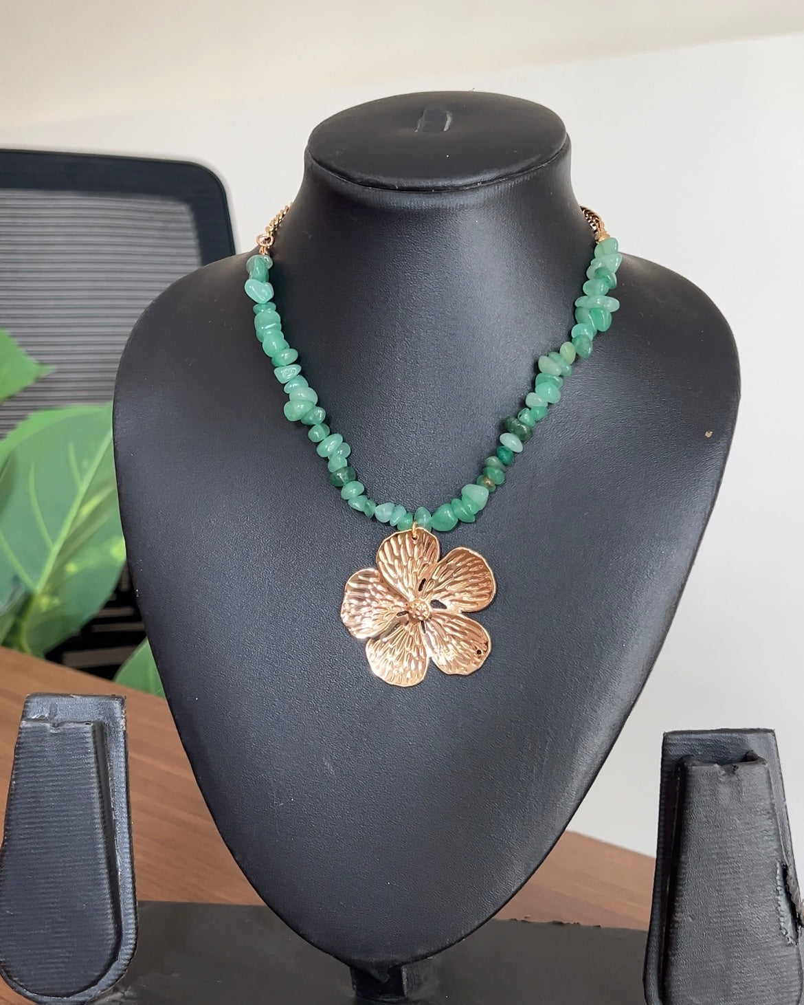 Material: Made with green stone chips and finished with a statement gold-plated flower pendant.