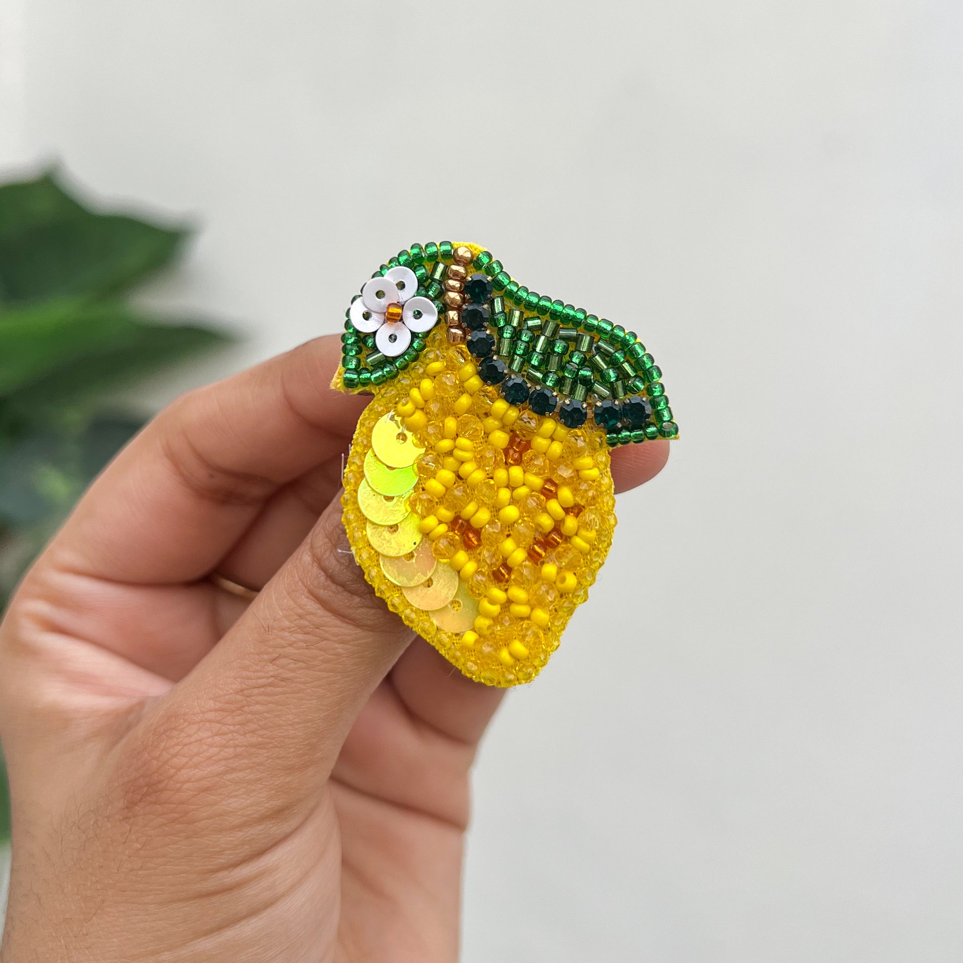 Features: A detailed handmade beaded brooch in a lemon design, featuring fine bead embroidery with textured yellow beads and delicate leaf detailing for a fresh, dimensional look.