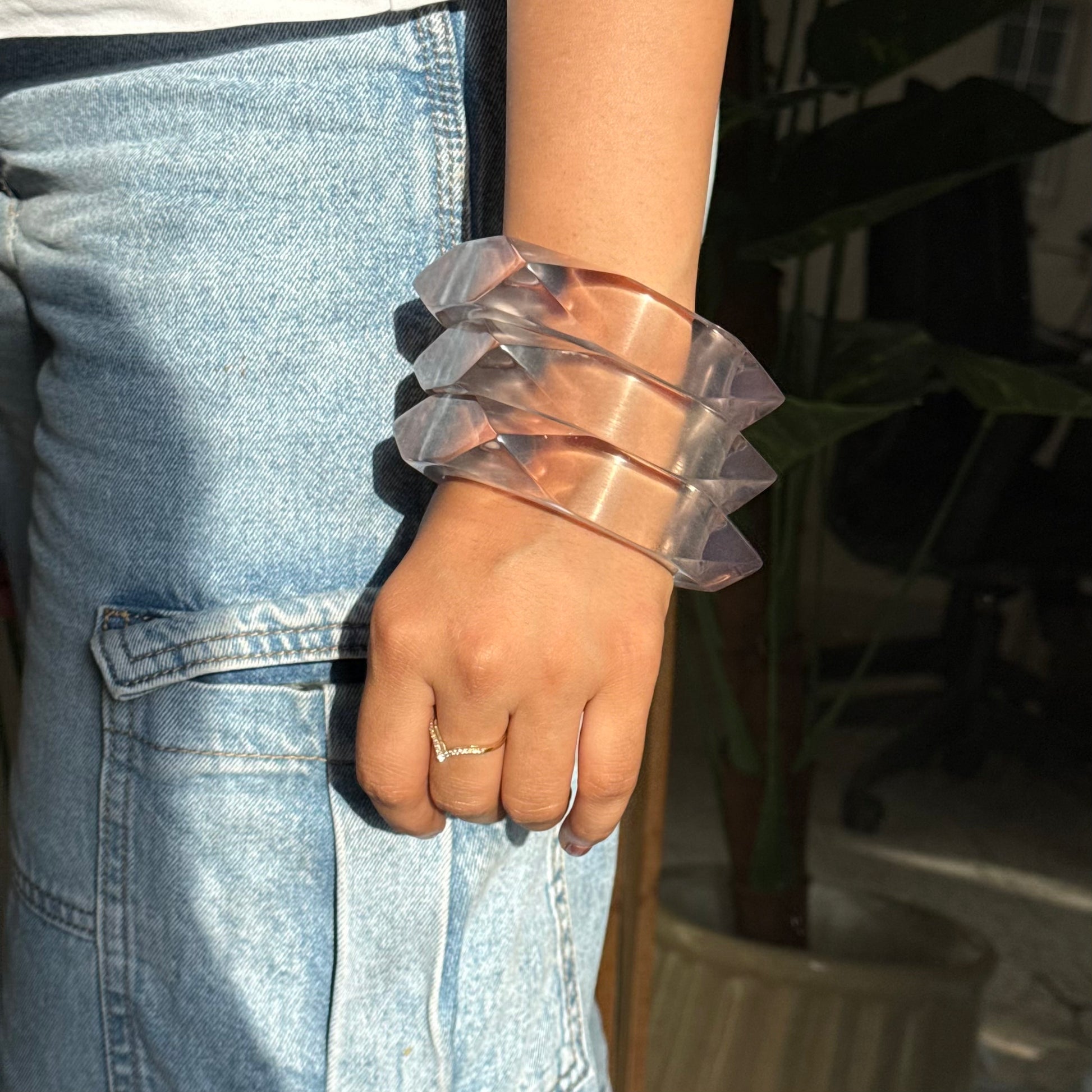 A sculptural statement that catches light with every move. This chunky bangle is crafted from clear resin with striking crystal-like pointed ends, giving it a modern yet ethereal vibe. Whether worn solo or stacked, it adds an artistic edge to any outfit.