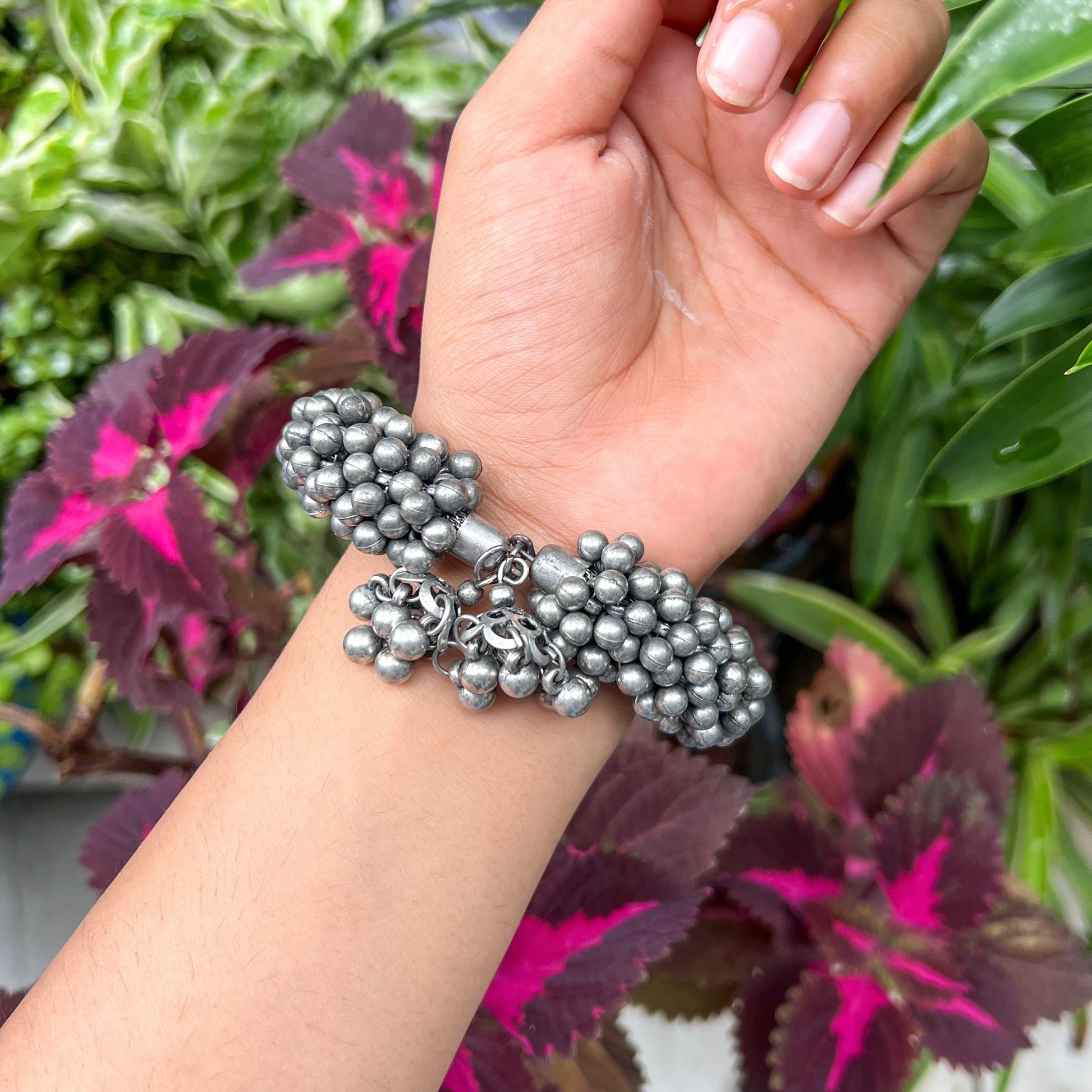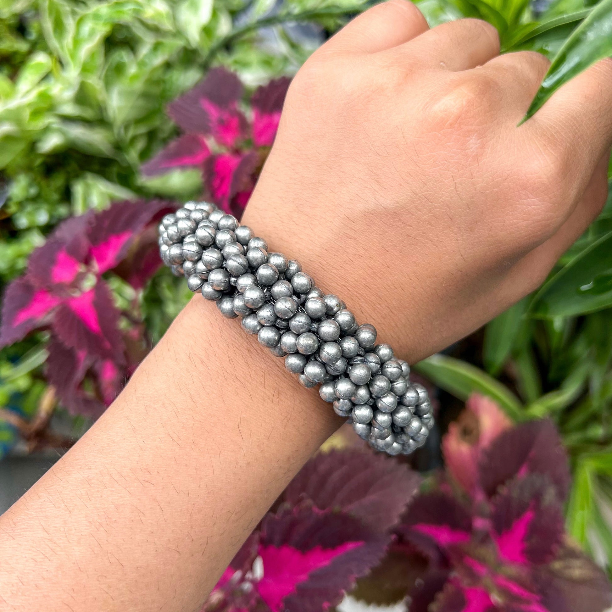 Bold, beaded, and beautifully handcrafted  the Tribal Cluster Bead Bracelet is a textural stunner that wraps your wrist in rustic charm. Made with clustered oxidized silver-toned beads, this piece adds instant depth and drama to your look. It features adjustable tassel ties at both ends for the perfect fit, making it as practical as it is striking.