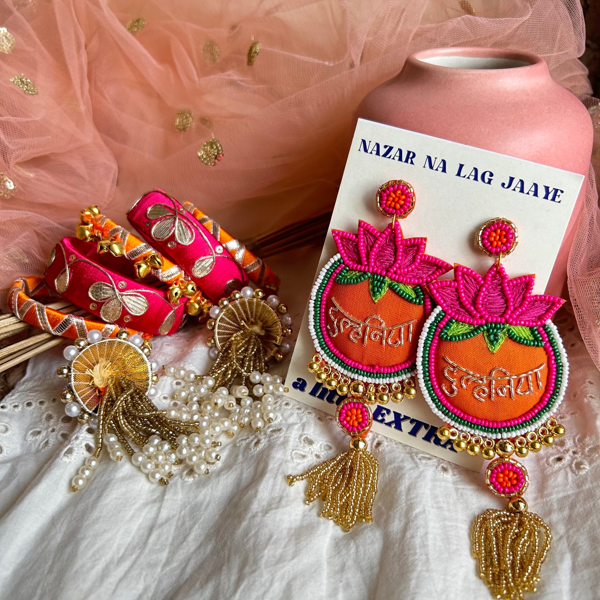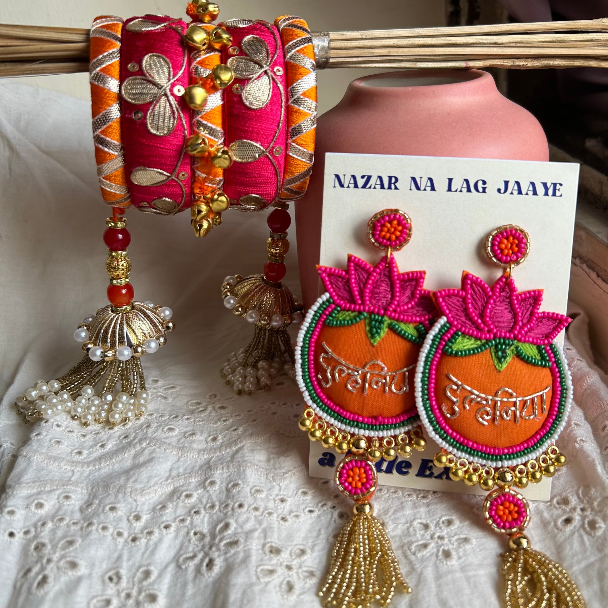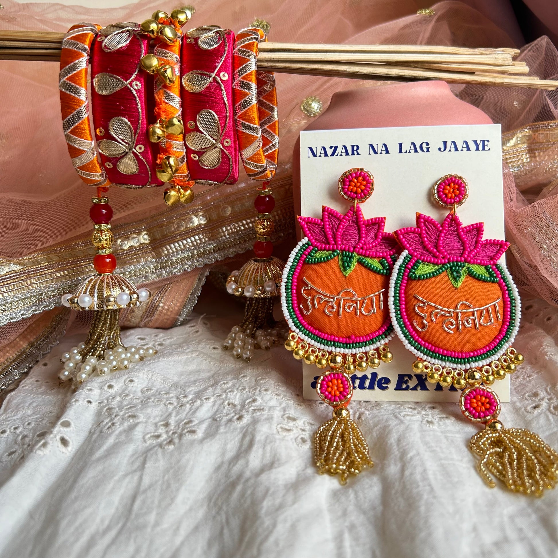 Introducing our delightful bridal combo, tailor-made to infuse the bride-to-be's special day with a touch of effortless elegance and charm. This enchanting set seamlessly blends the classic appeal of bangles with the playful allure of earrings, creating a versatile ensemble perfect for both the bride's big day and as a thoughtful gift.ÂÂ
