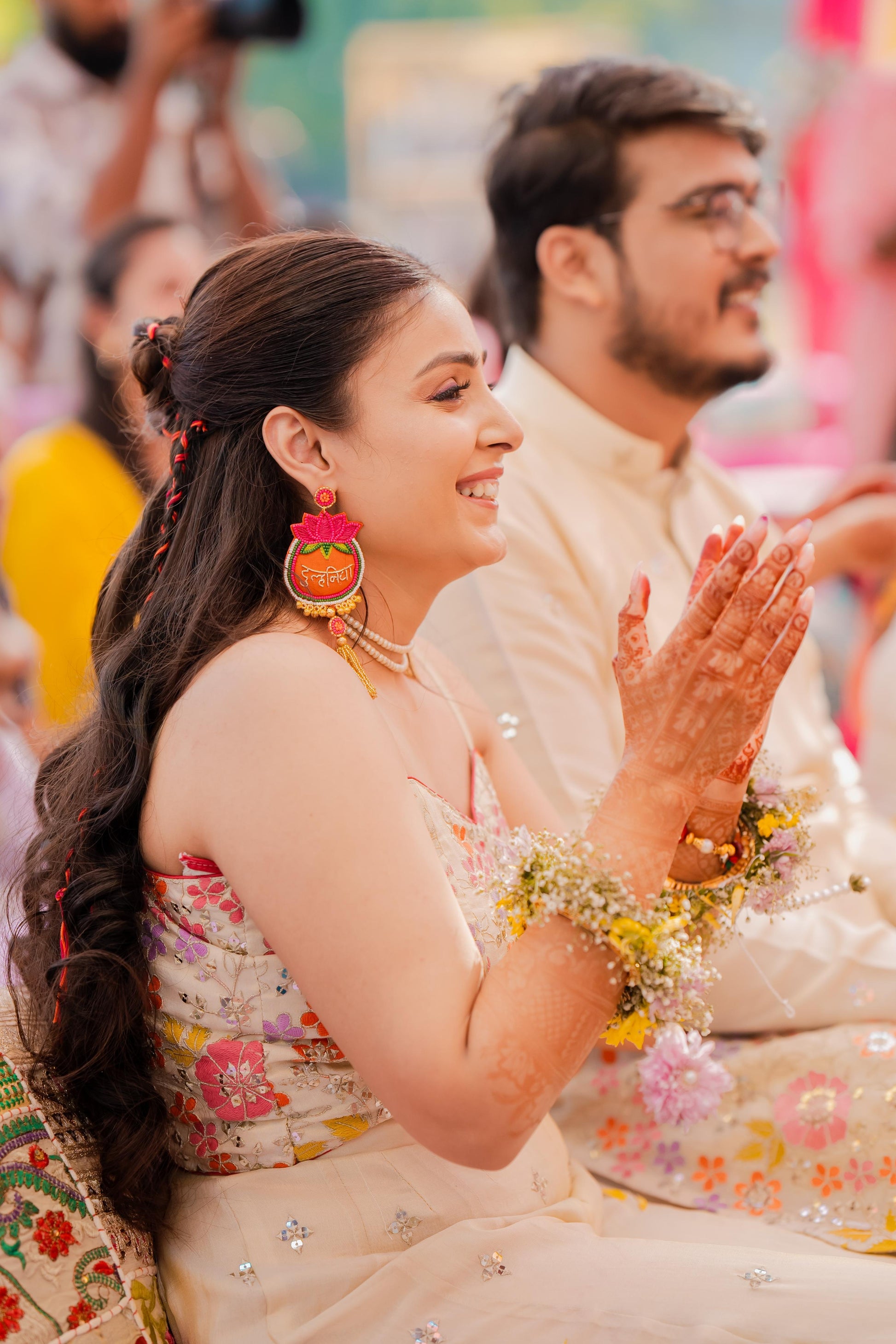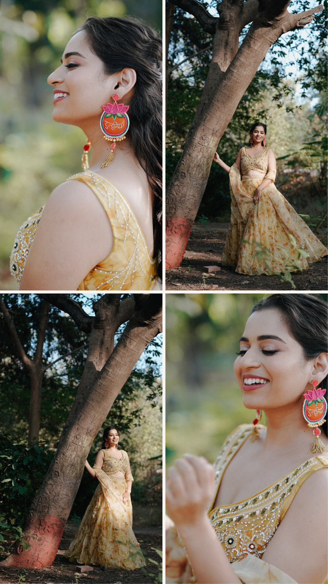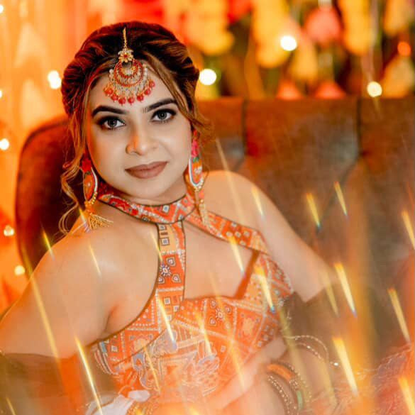 Colour: A festive fusion of blush pink, bright orange, and rich golden tones that complement both traditional Indian attire and contemporary bridal looks.