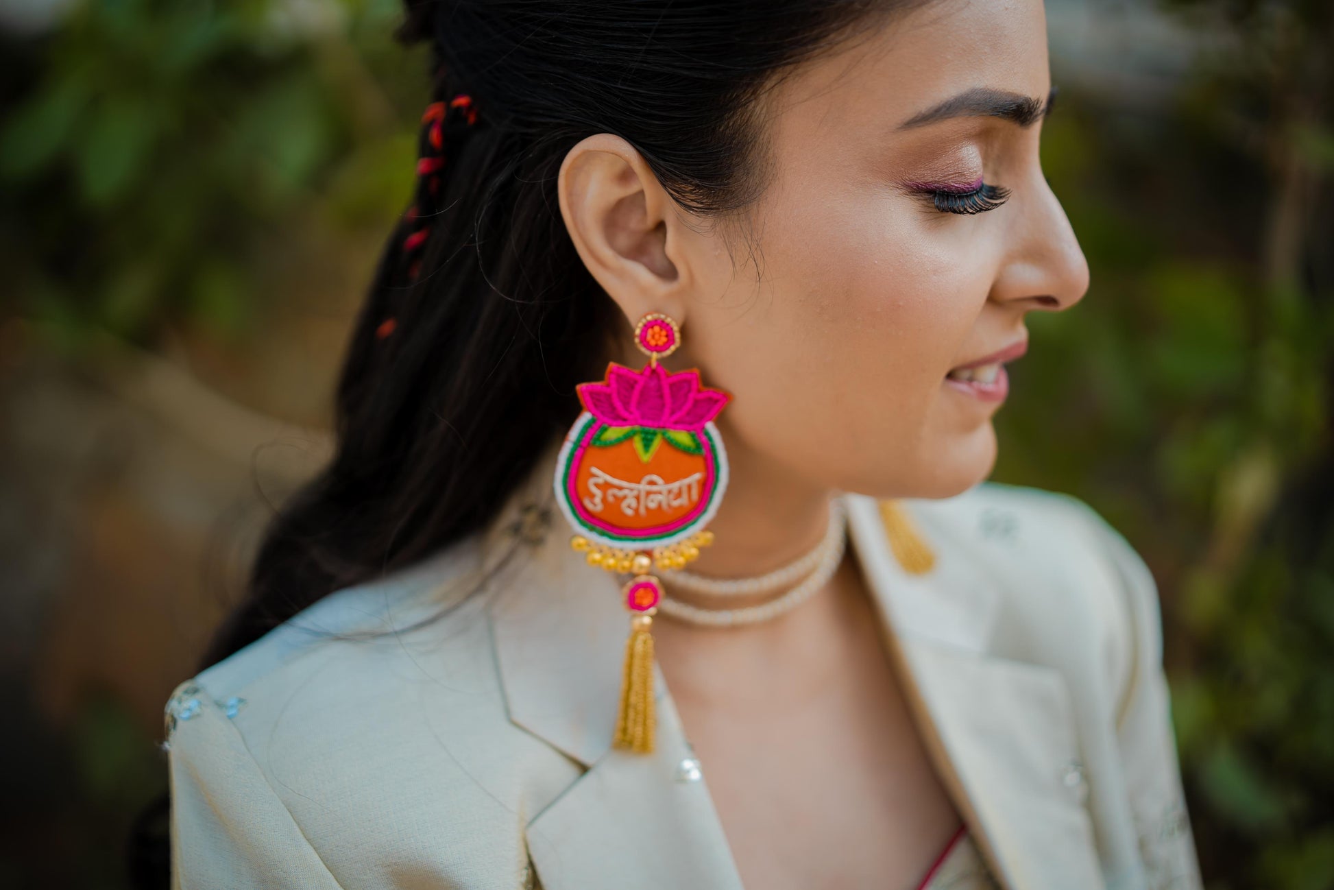 Style: Long, statement earrings featuring an ornate design in bridal hues of pink, orange, and gold  a harmonious blend of vibrance and grace perfect for every bride’s radiant aura.