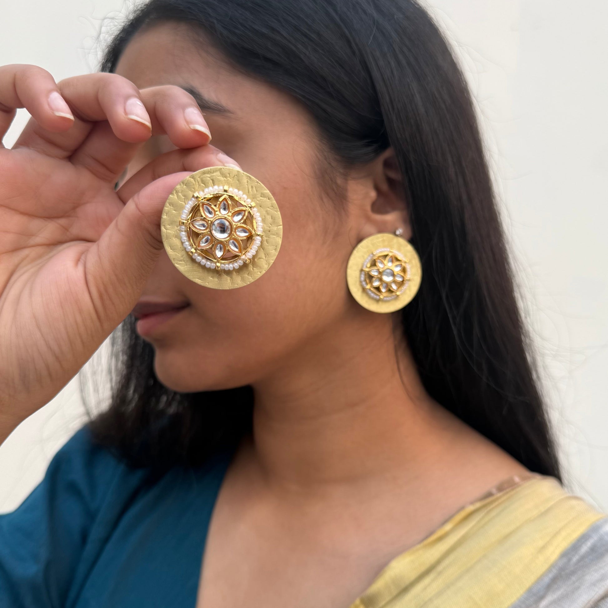 Design: Features an elegant circular base with a beautifully crafted sunburst motif at the center, creating a bold yet refined ethnic look that stands out instantly