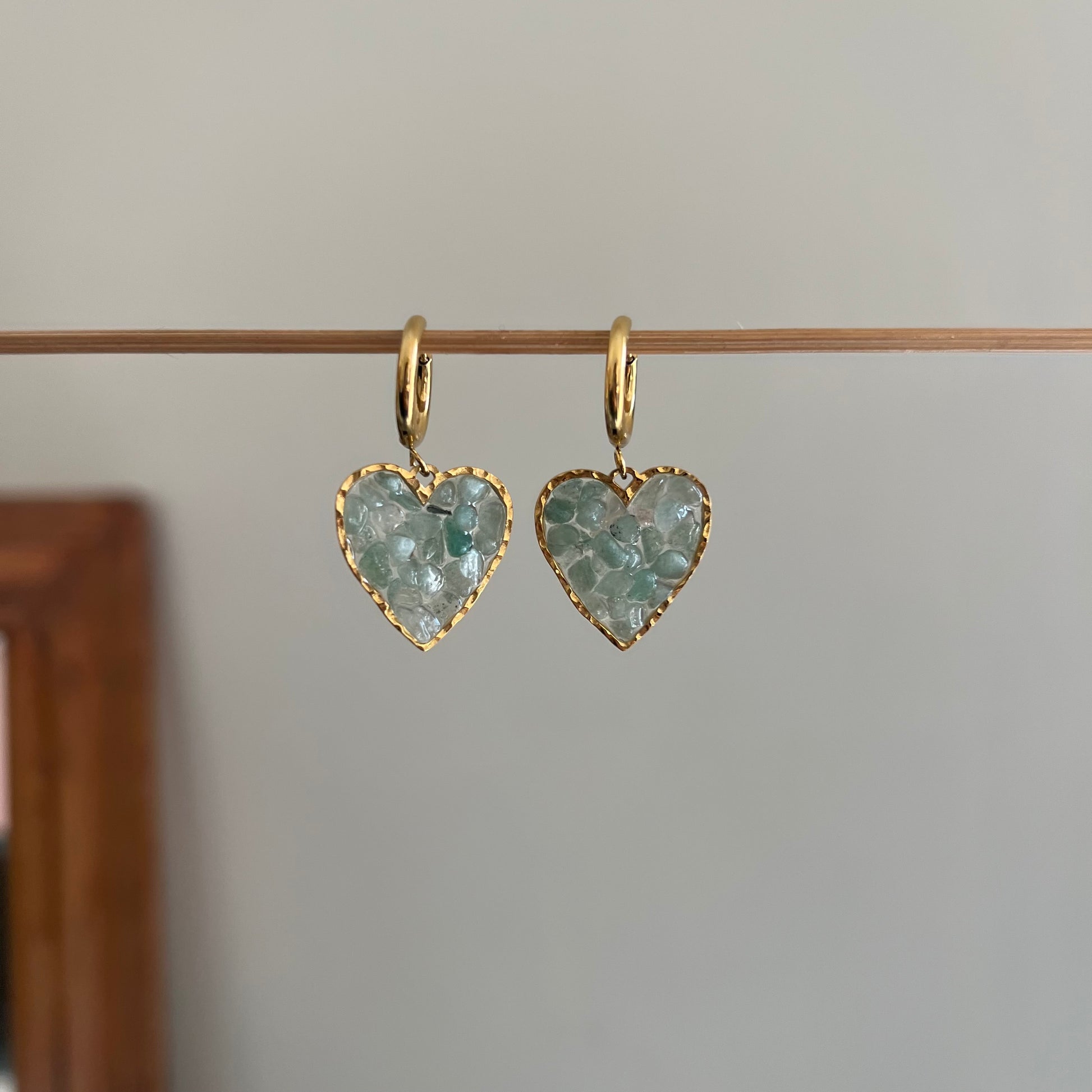 These gold-finish mini hoops feature translucent heart-shaped drops, delicately framed with a textured gold border. The subtle shimmer of the crystal-like detailing adds a fresh, airy feel, making them perfect for both everyday wear and special moments.