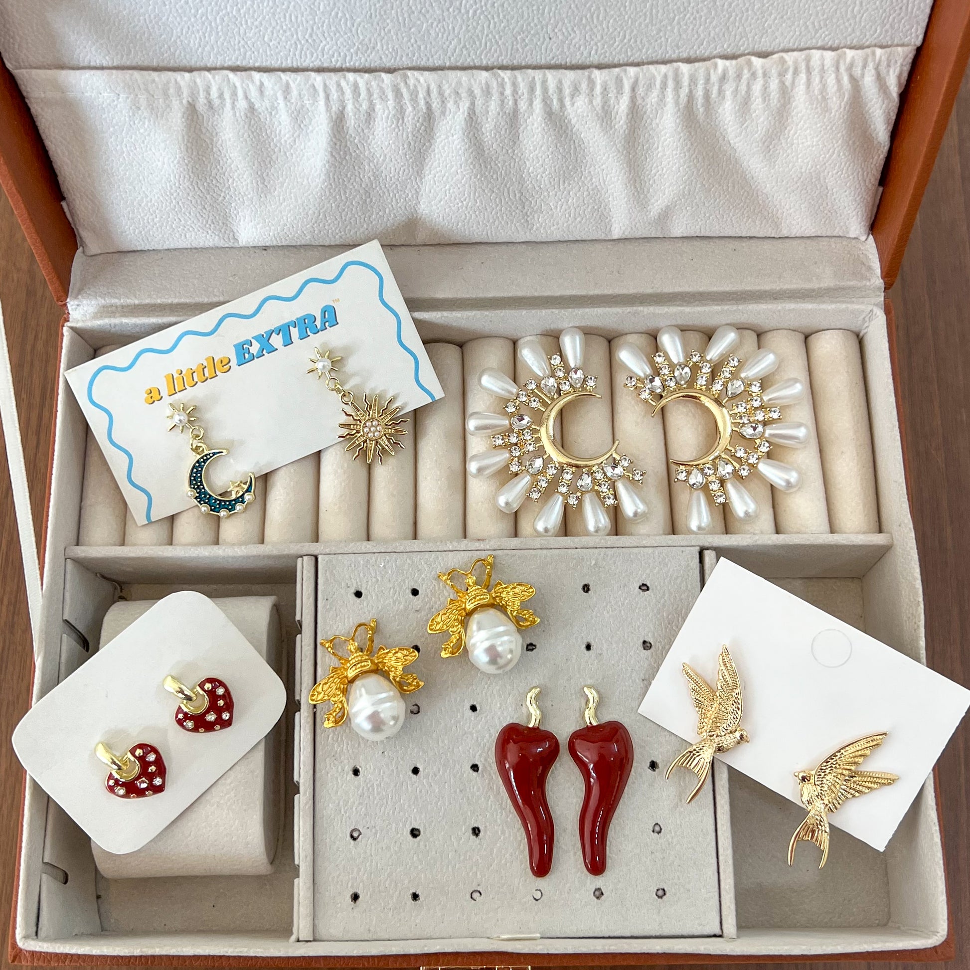 Style: Statement luxe contemporary / chic dainty mix (sun + moon celestial, cute hearts, bold studs + pearl bee aesthetic)