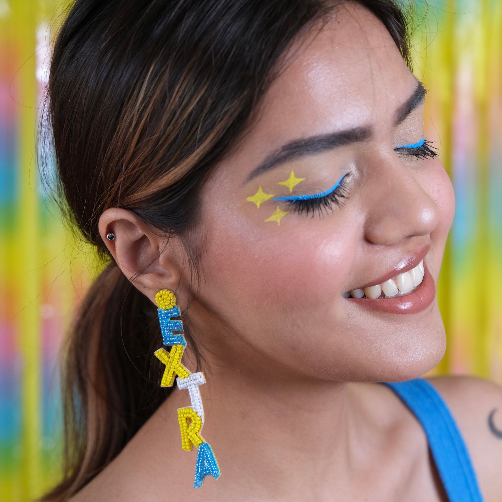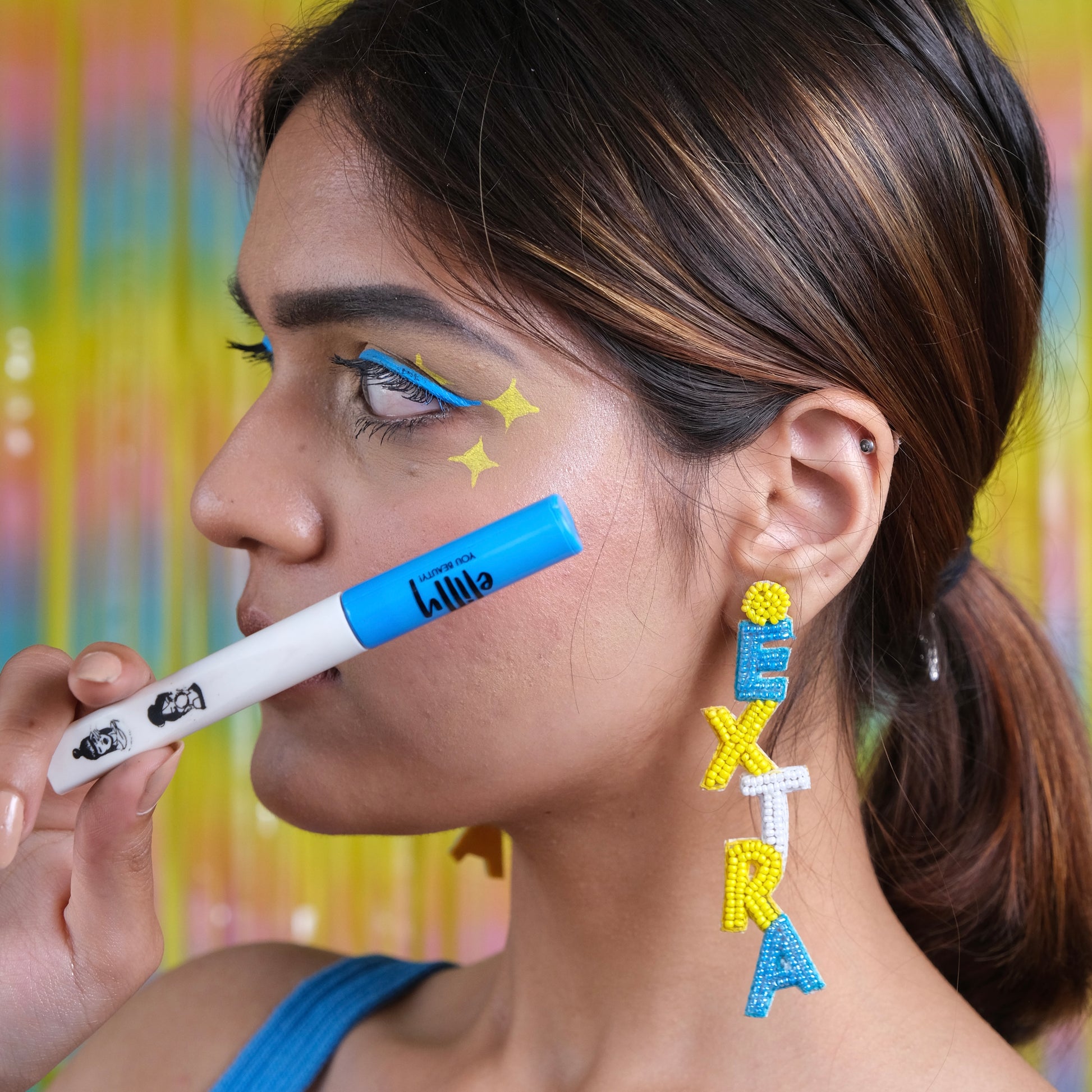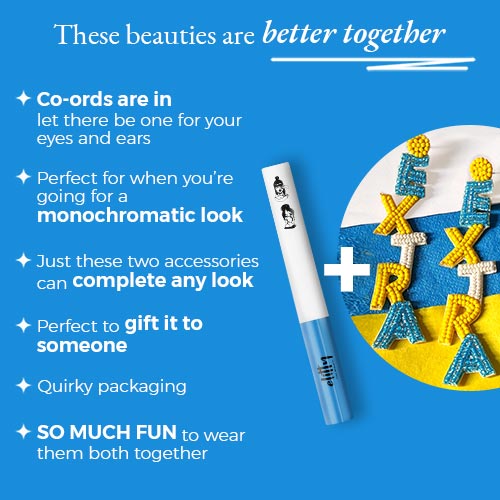 A little back story: Both the founders of the brand met backstage and clicked instantly. The core of both the brands is the same. It's time to be colourful, extra, peppy and vibrant, and what's better than to create something that we know you would love. A combo: an eyeliner that matches your earring.