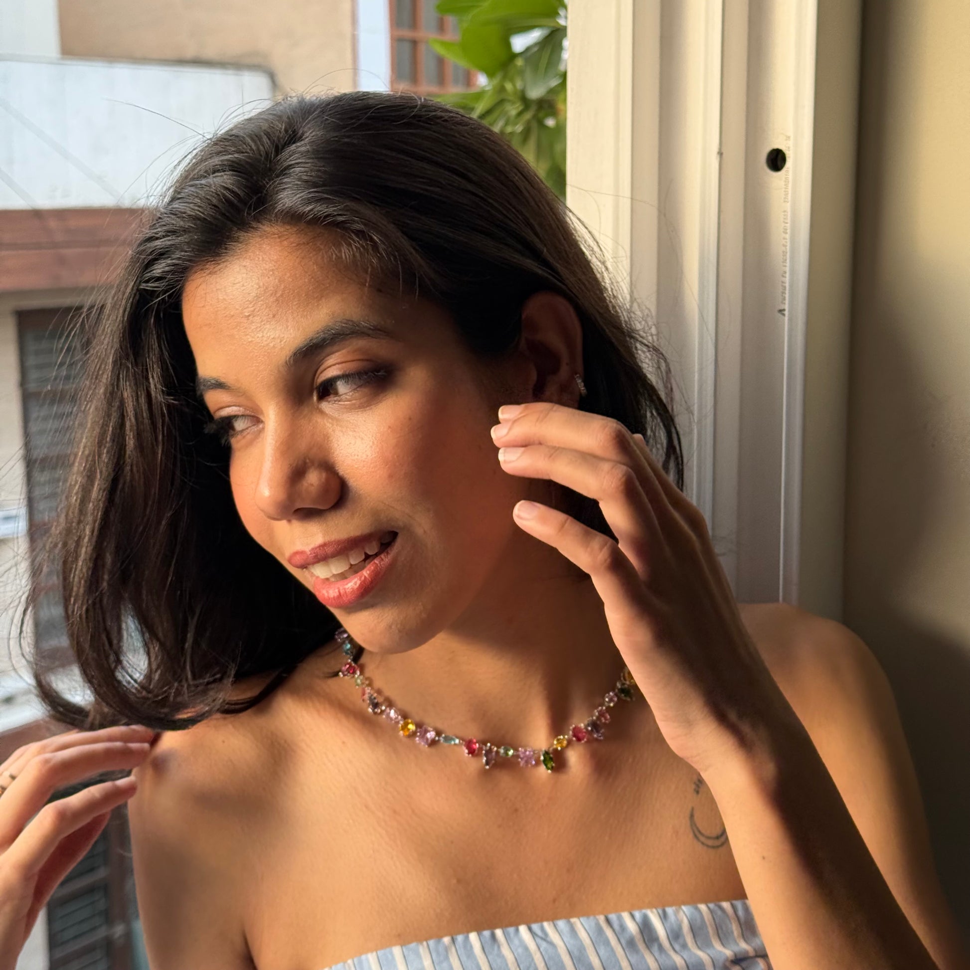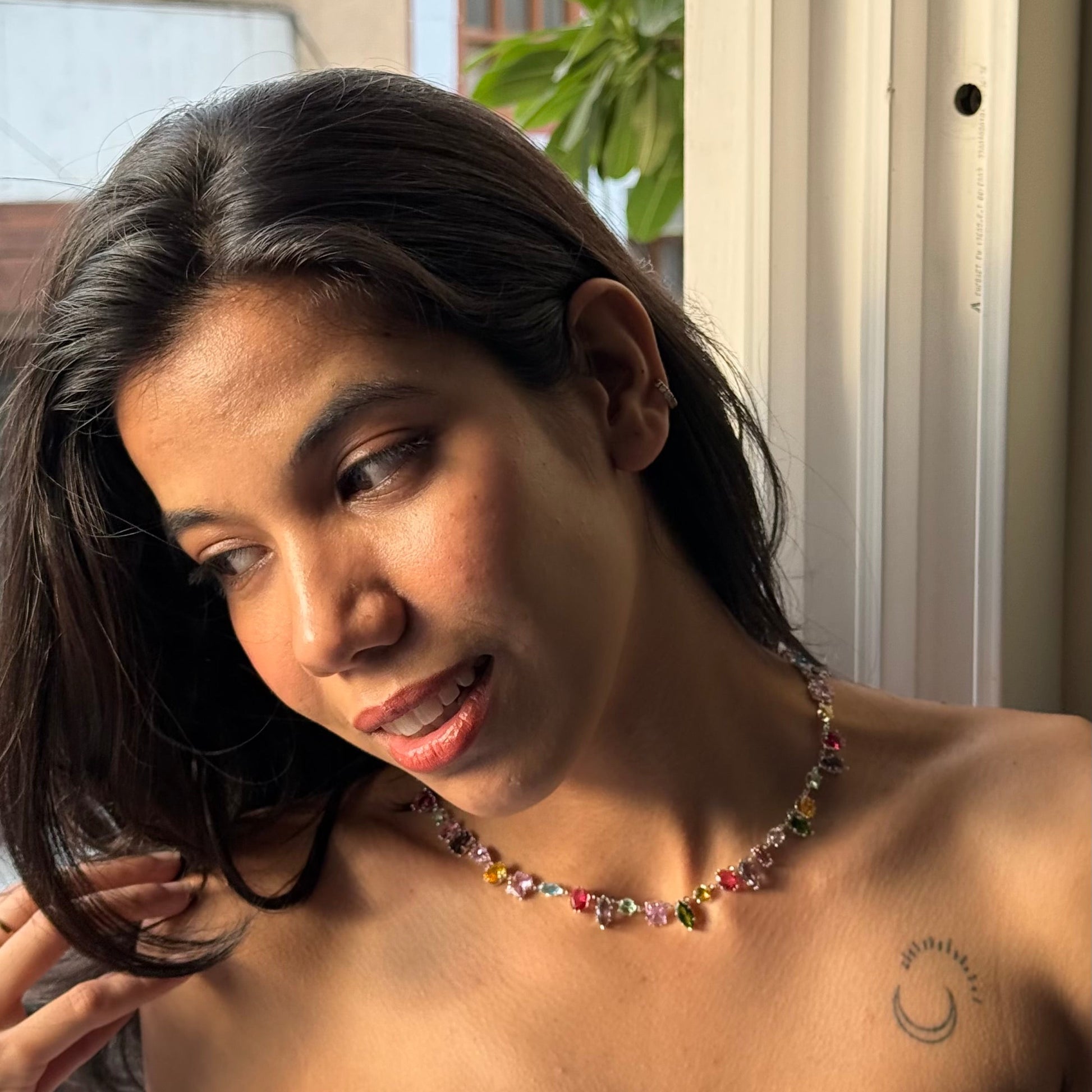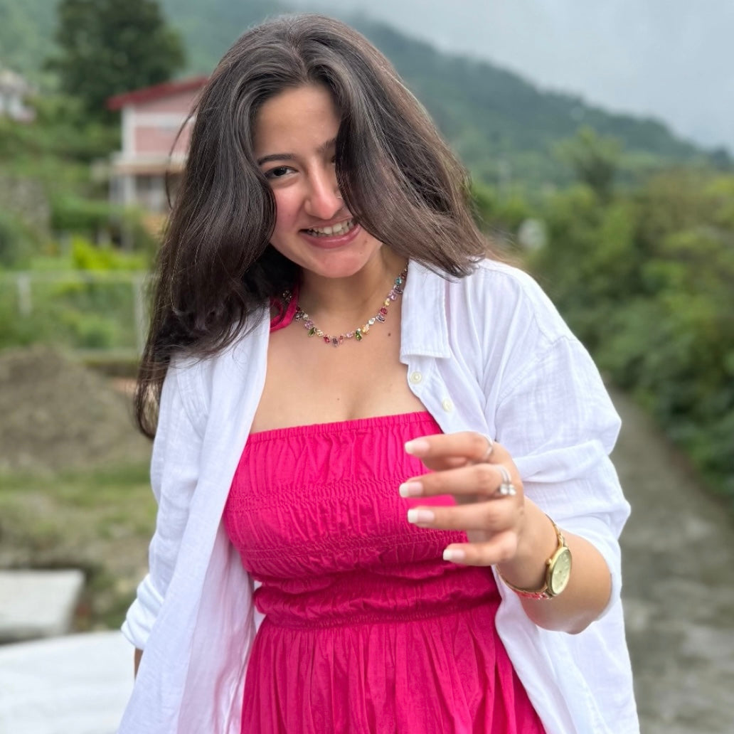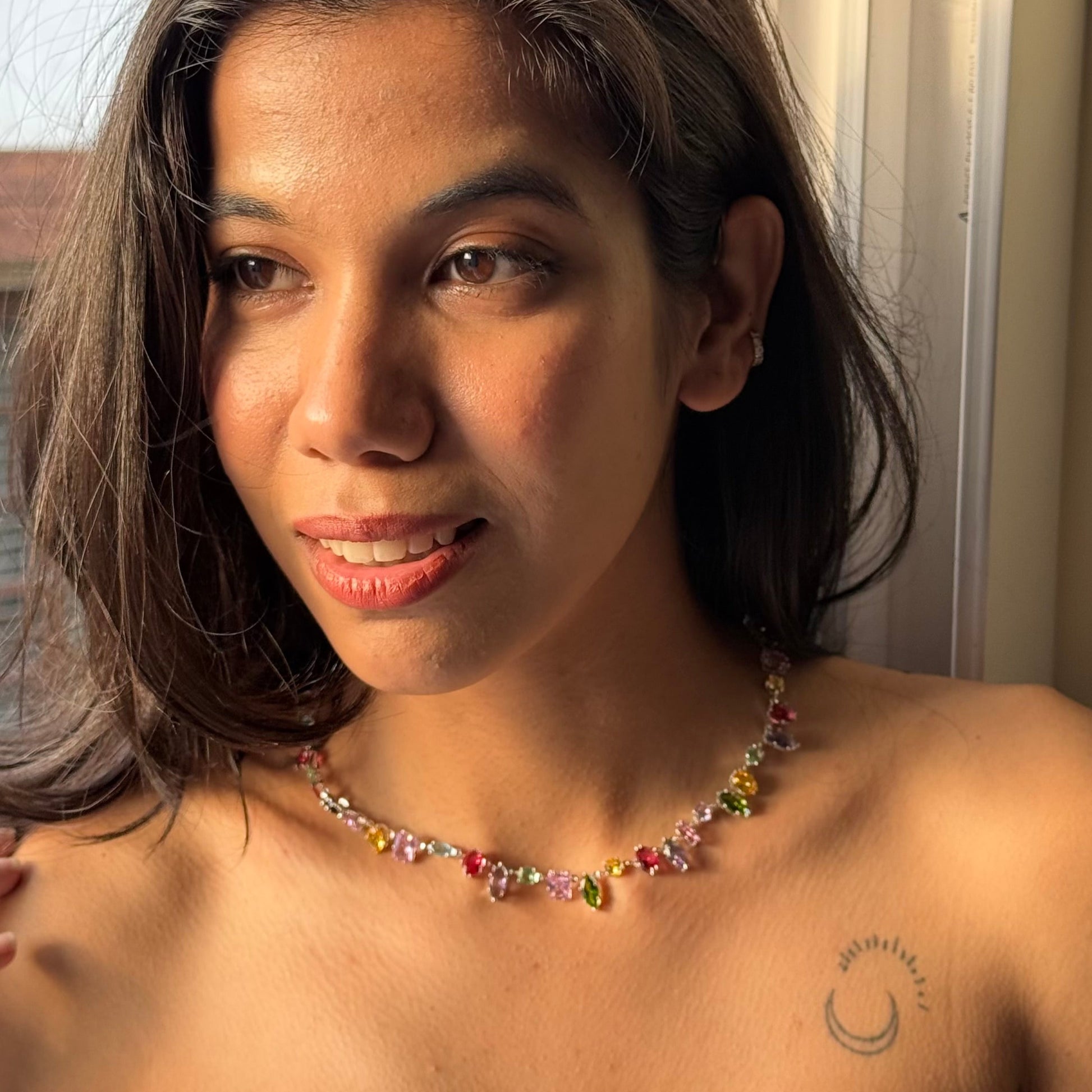 Glass Garden 18K Gold Plated Rhinestones Neckpiece, a dazzling fusion of elegance and shimmer. This radiant piece features sparkling rhinestone glass stones set against a luxurious 18K gold-plated silver chain  perfect for turning heads, whether you're keeping it casual or dressing to impress.