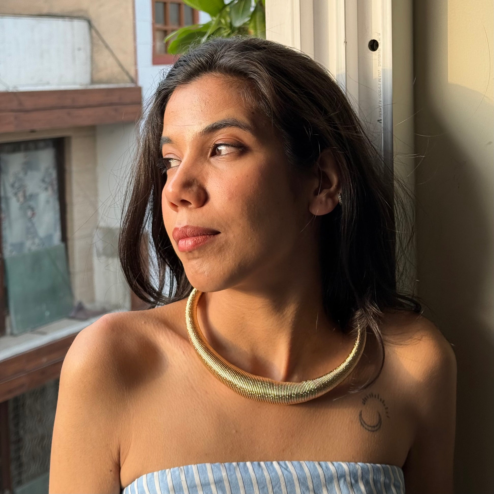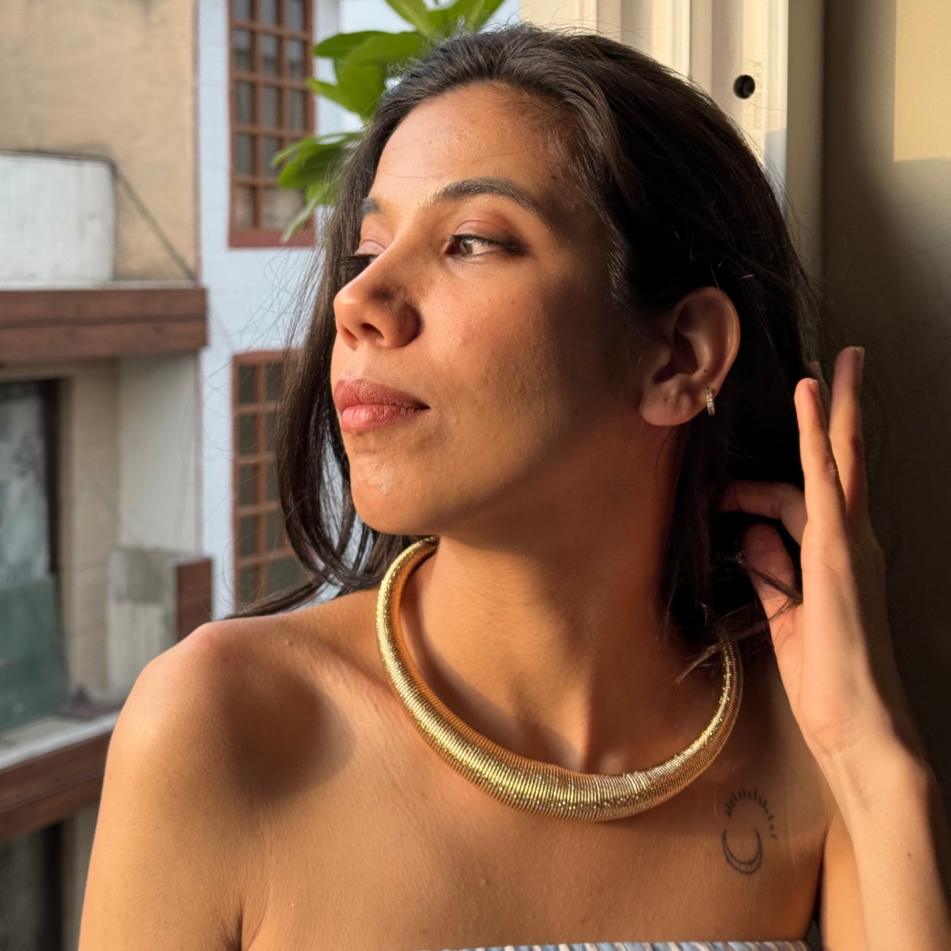 Glow Getter Alloy Neckpiece, a radiant essential designed to elevate your neckline with bold, golden charm. This statement piece is made to turn heads  sleek, edgy, and perfect for dressing up your everyday fits or turning up the glam for nights out.
