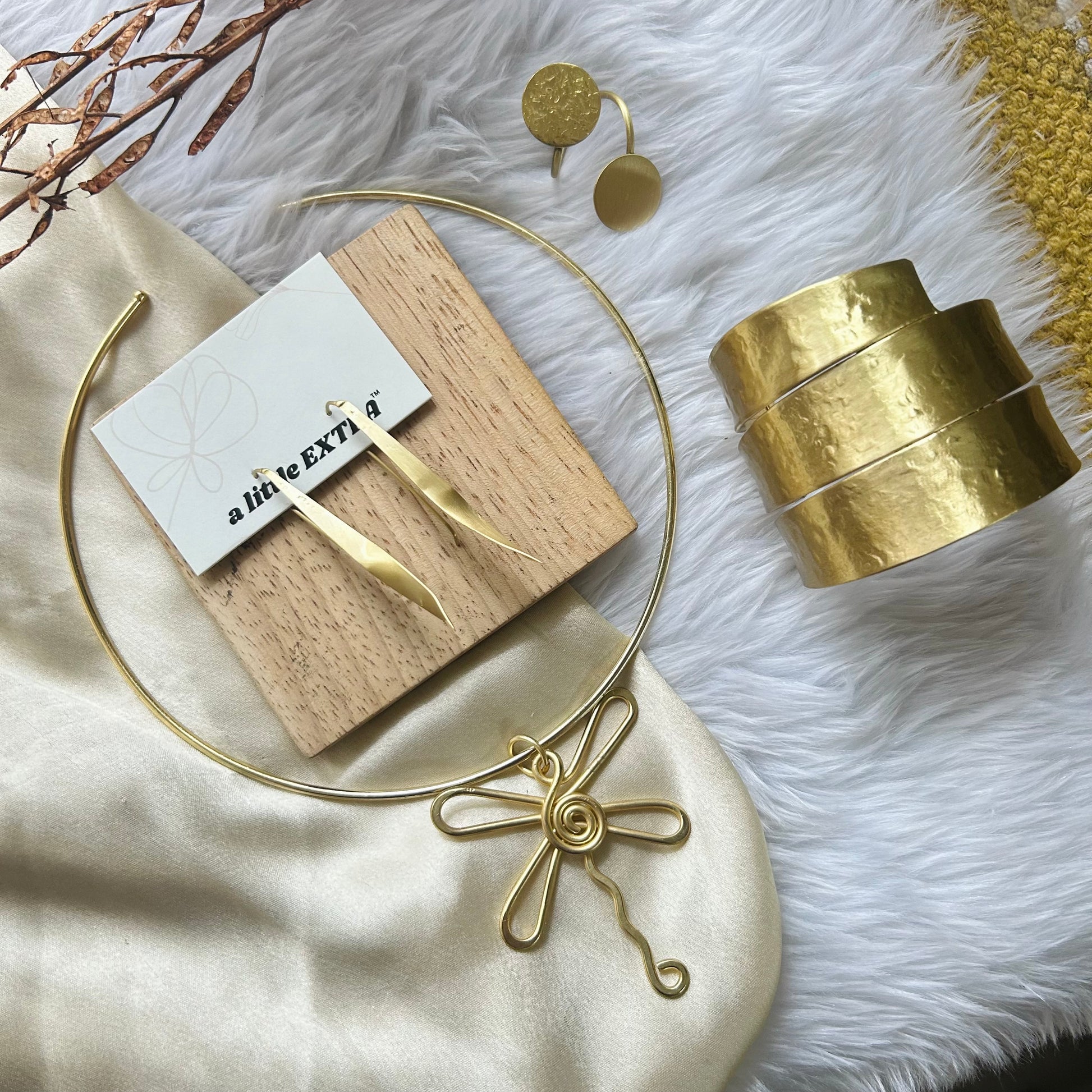 Elevate your style with the Go To Brass Combo, a stunning set, all crafted from high-quality brass. This versatile set is perfect for any occasion, from casual outings to formal events. The cuff adds a bold statement to your wrist, while the earring offers a touch of elegance. The choker beautifully frames your neck, and the ring completes your look with a chic, refined finish. Timeless and sophisticated, this combo effortlessly enhances your ensemble, making it a must-have for those who appreciate both style and versatility.