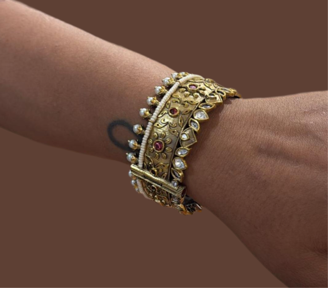 Embrace timeless grandeur with our Gulshan Kada, a handcrafted piece that echoes the artistry of royal heritage. Featuring an antique gold finish, delicate floral engravings, and embedded Kundan polki with ruby accents, this kada is further enhanced with a border of pearl-like detailing.
