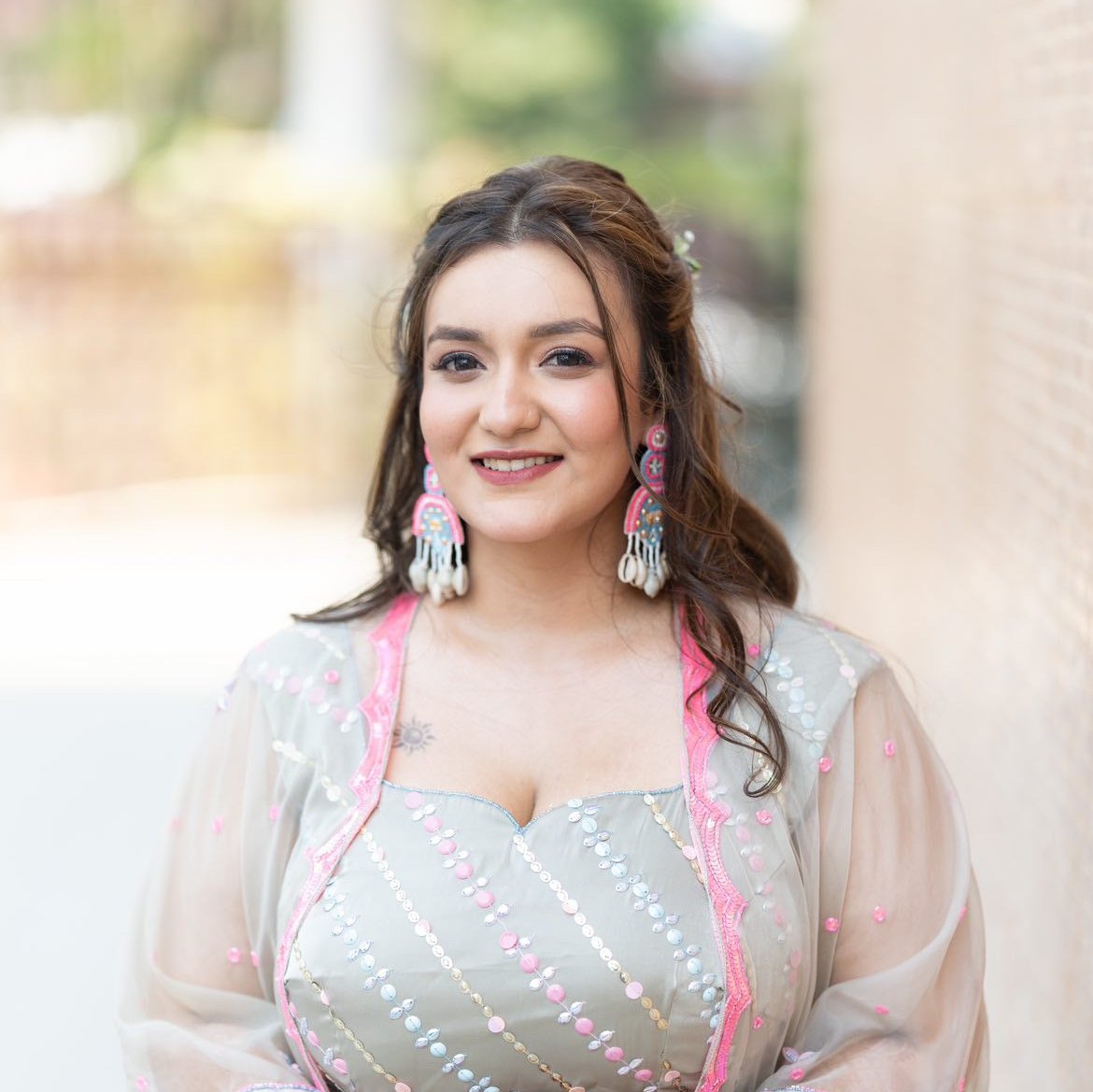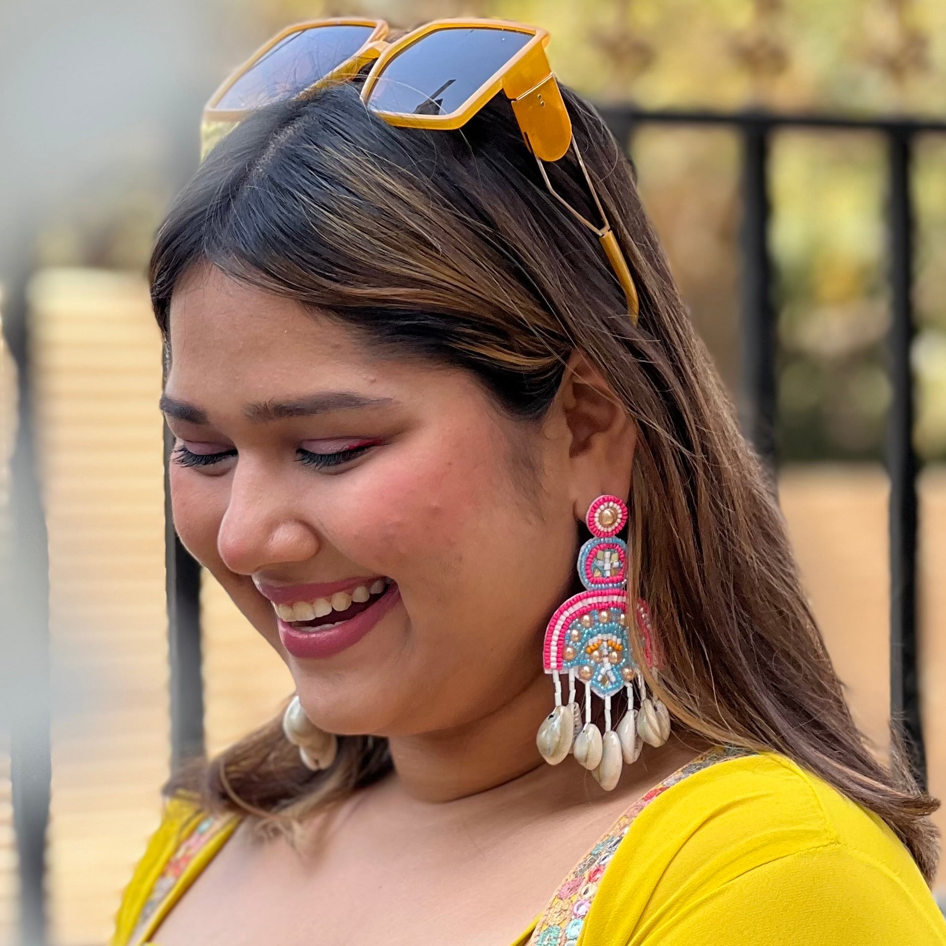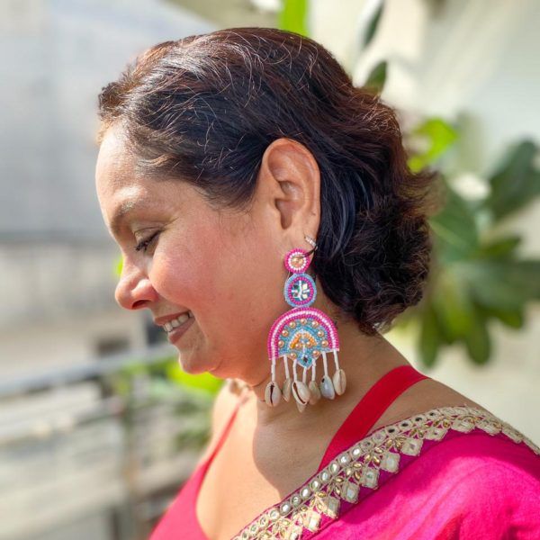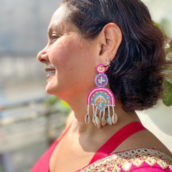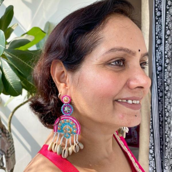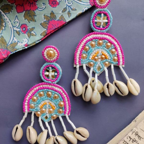 Hawa Mahal Pink Beaded Shell Earrings, where regal charm meets festive flair. Inspired by the architectural splendor of Rajasthan’s iconic Hawa Mahal, these earrings are meticulously handcrafted with intricate embroidery, delicate pink beads, and subtle shell accents  a perfect homage to heritage and style.