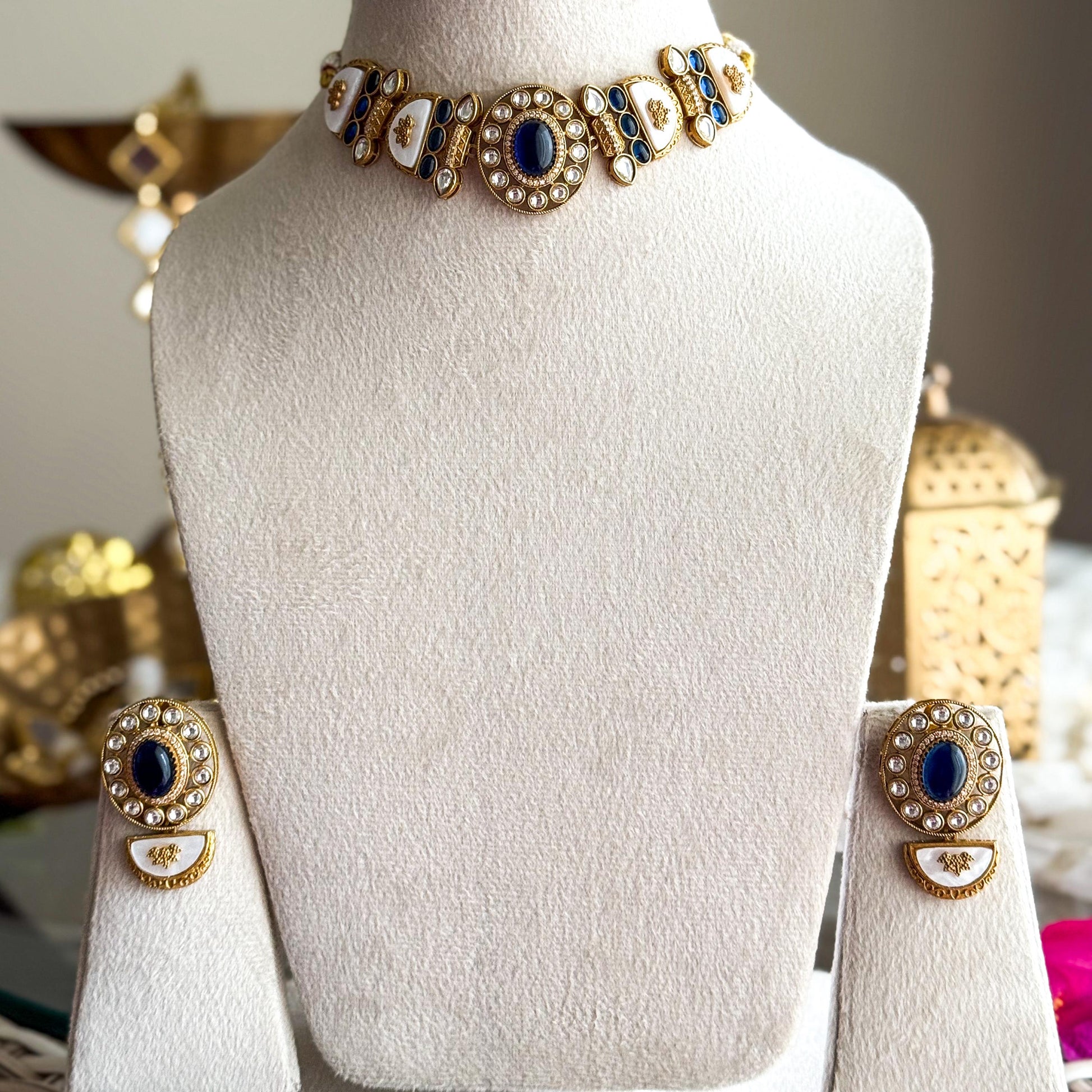 An opulent choker designed with a bold oval centerpiece embedded with sparkling moissanite polki and a deep green stone at its heart. Flanked by alternating enamel panels in ivory and green with miniature floral motifs and drop-shaped polki accents, the design is rooted in royal aesthetics. Paired with matching earrings that echo the central motif, this set strikes a perfect balance between old-world richness and wearable sophistication.