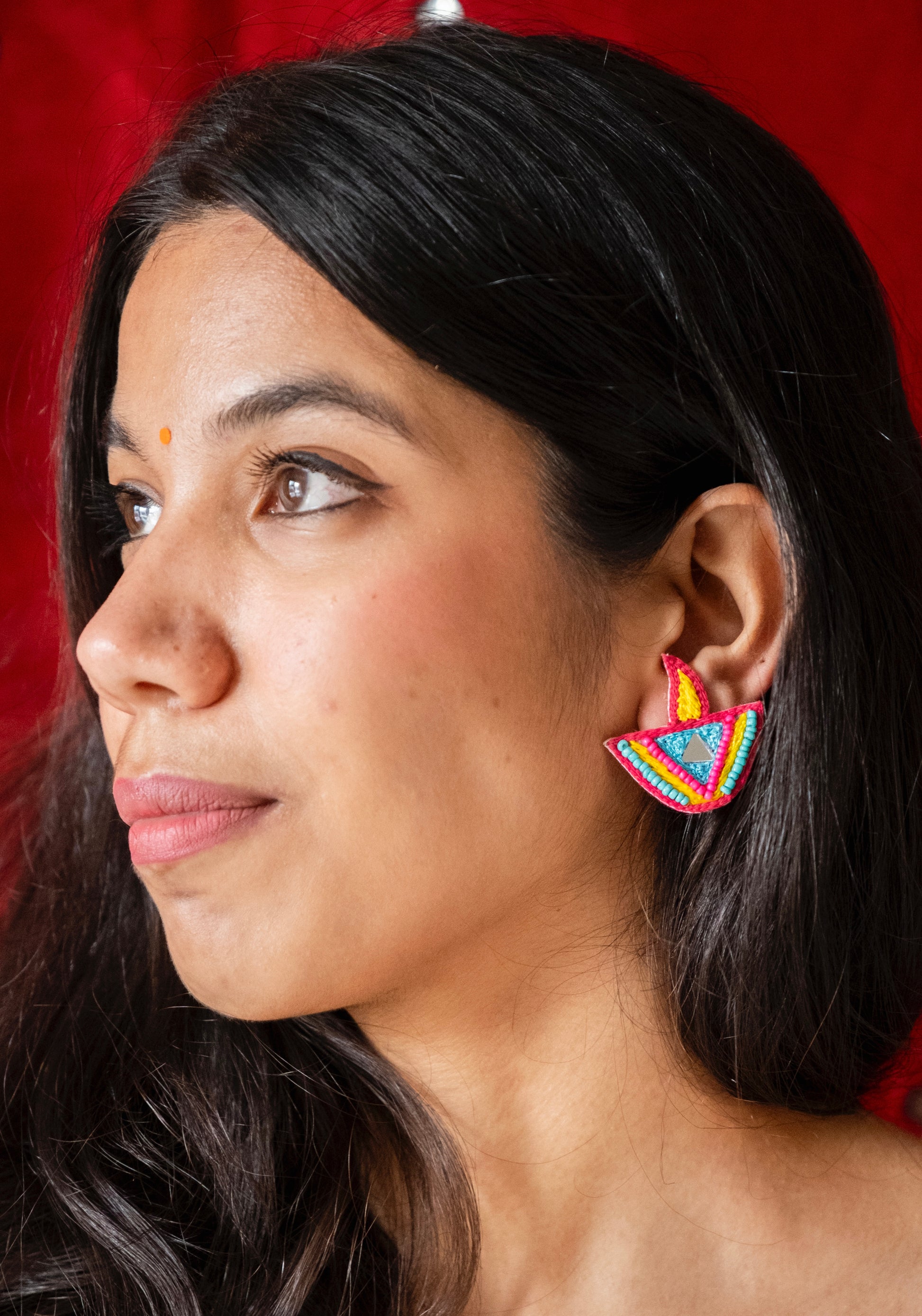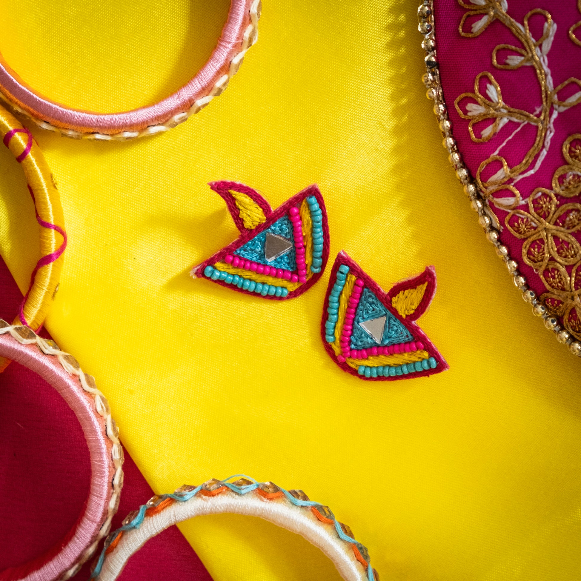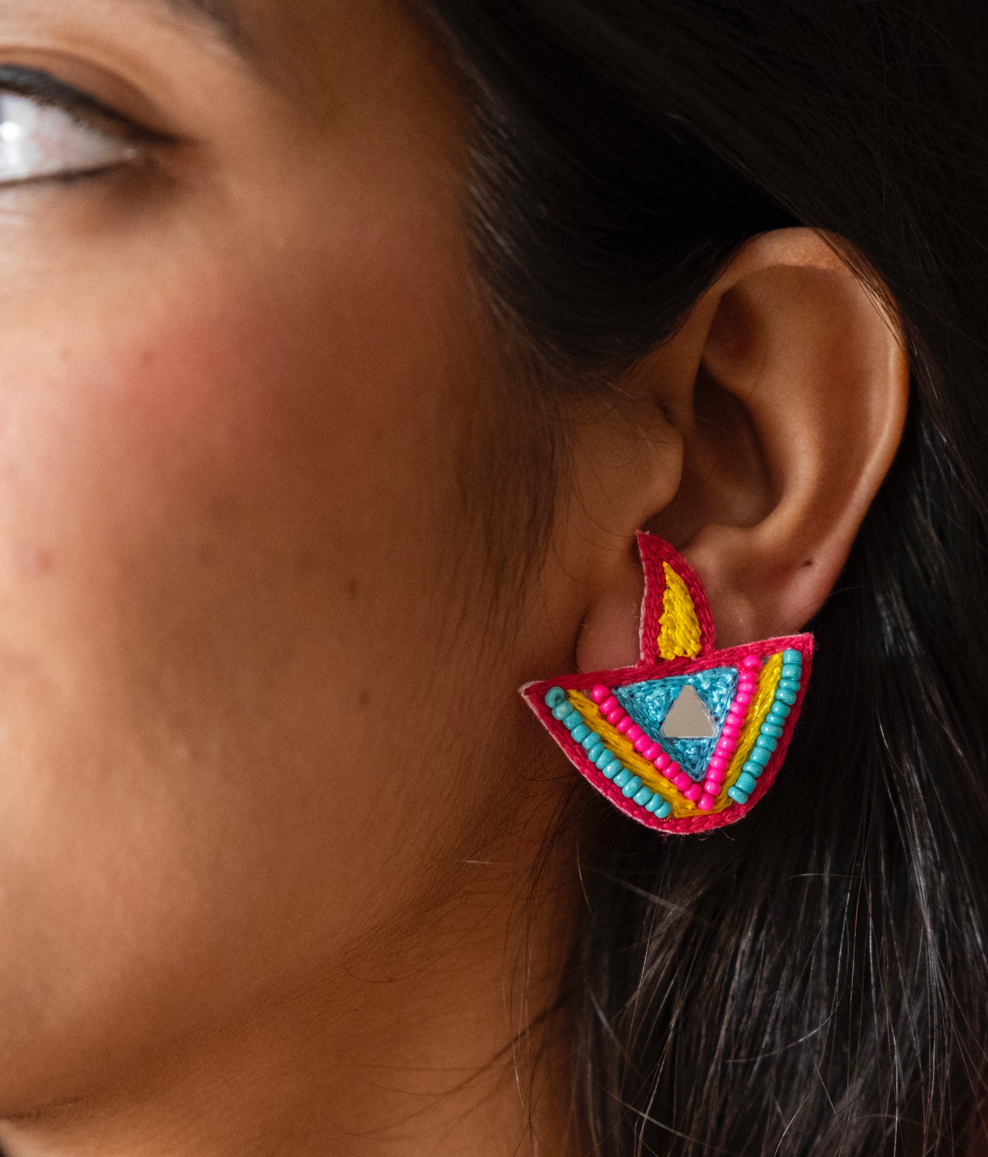 Khushi Diya Blue Handmade Beaded Earrings, where festive charm meets playful elegance. These ethnic mini-sized earrings are delicately crafted in a Diya-inspired silhouette, radiating the joyful spirit of Indian celebrations. Embellished with vibrant bead and threadwork, they capture the essence of a flickering flame  symbolizing light, warmth, and tradition.