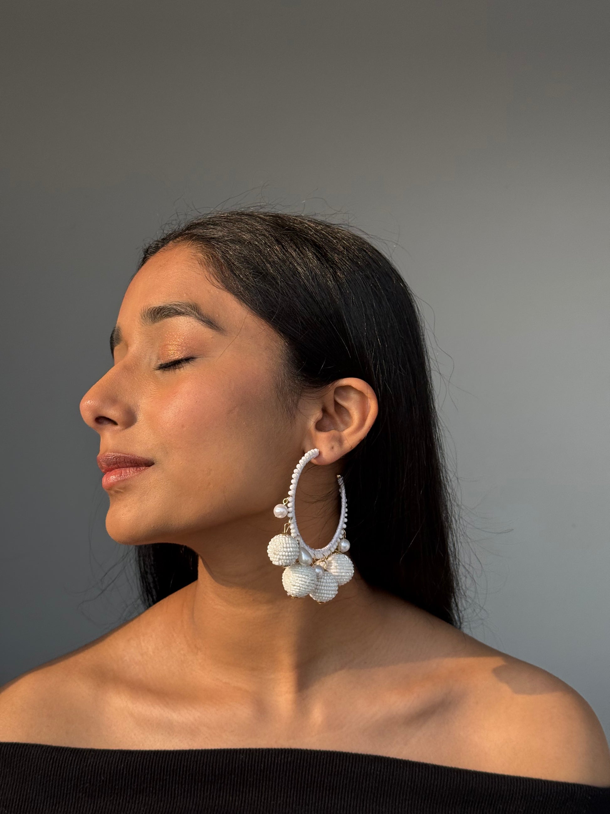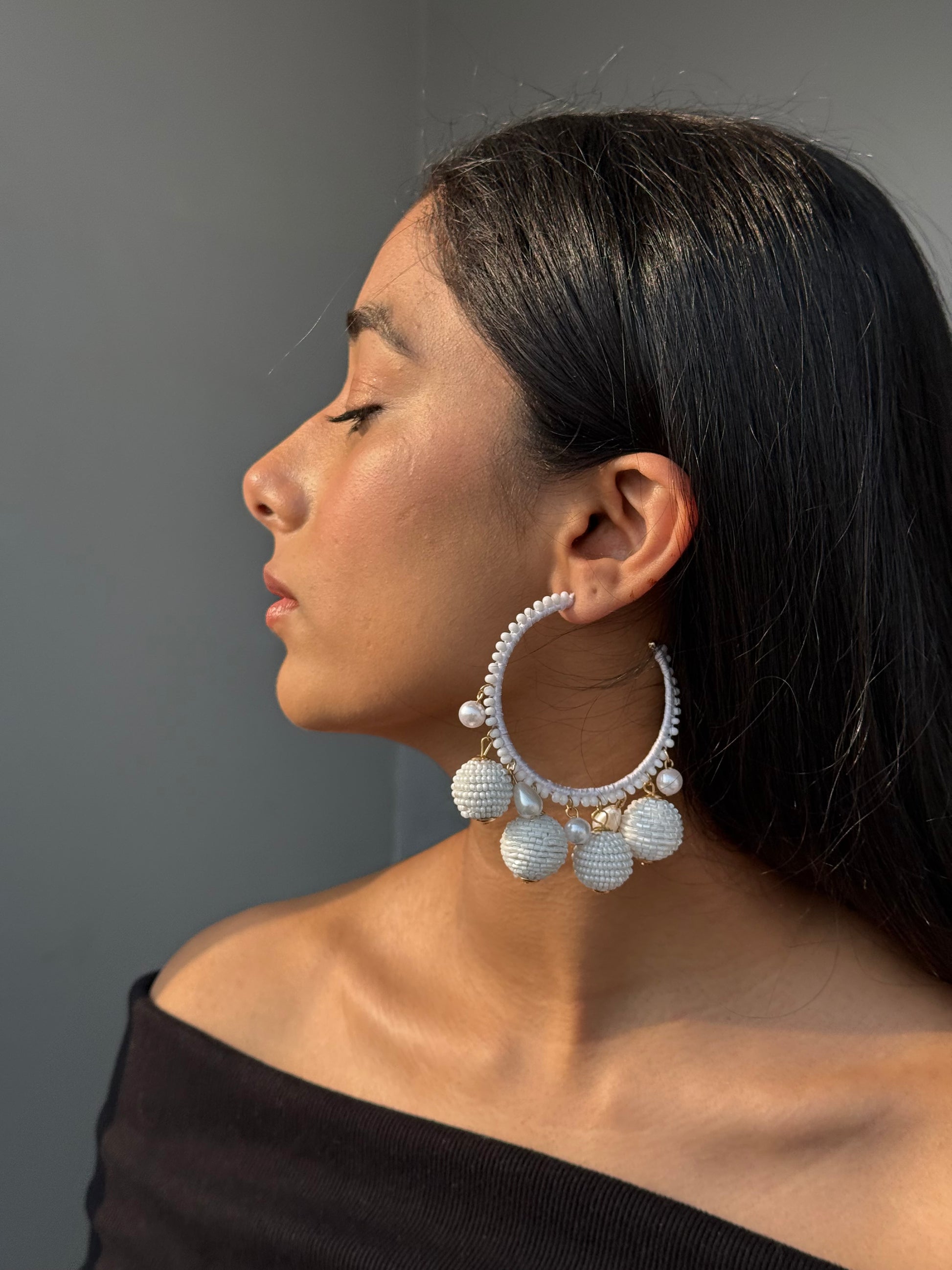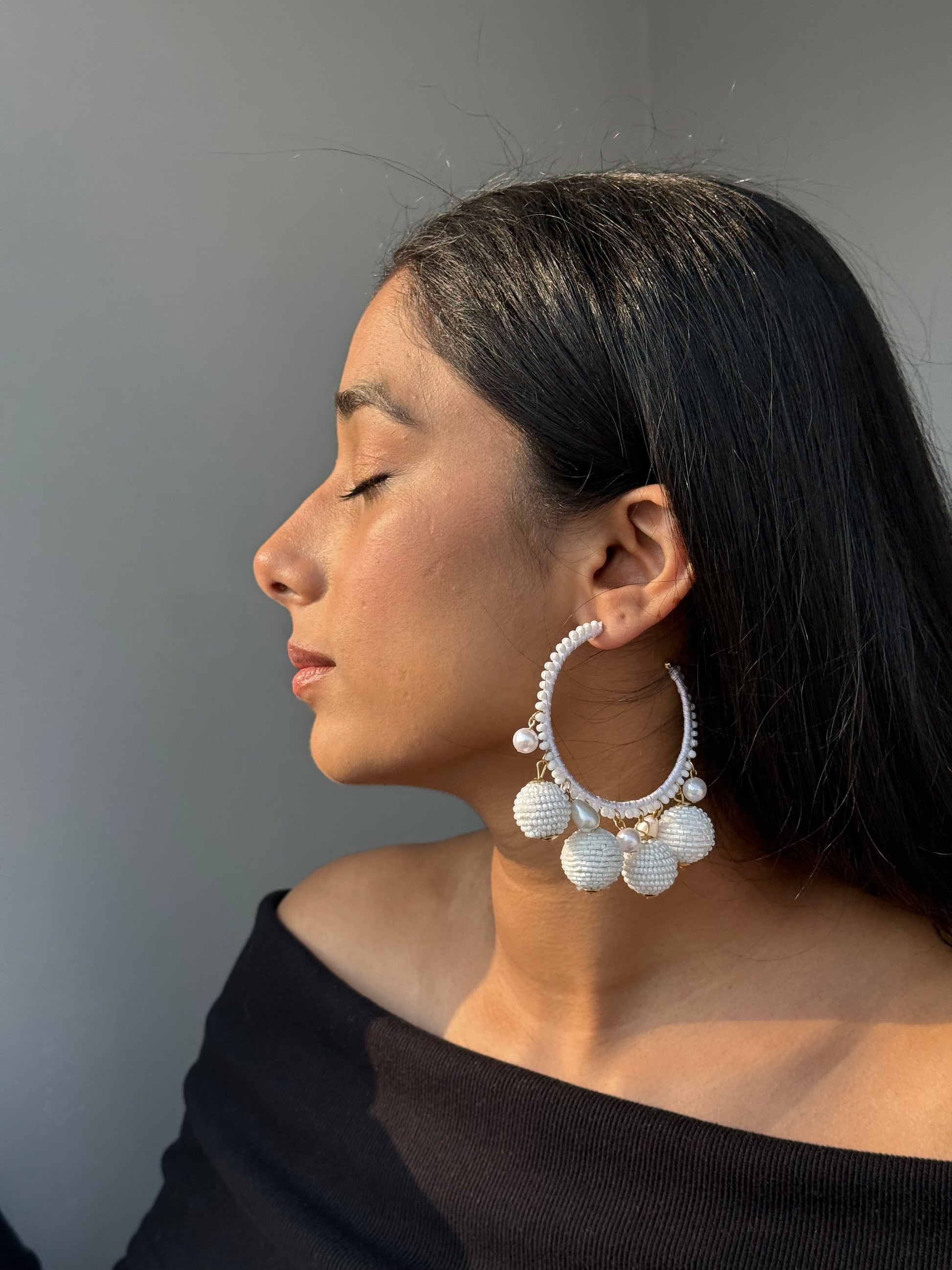 Introducing the Laila Chunky White Hoops – a perfect blend of bold style and delicate details. These hoops feature stunning beaded embellishments, with the intricate "cutdana" beautifully crafted on the hanging balls, adding a unique cultural touch to a modern design. Despite their eye-catching look, these earrings are lightweight, ensuring comfort without compromising on style. Made from premium materials, the Laila Chunky White Hoops are the ideal accessory to make a statement, whether you're going for a traditional or contemporary vibe.