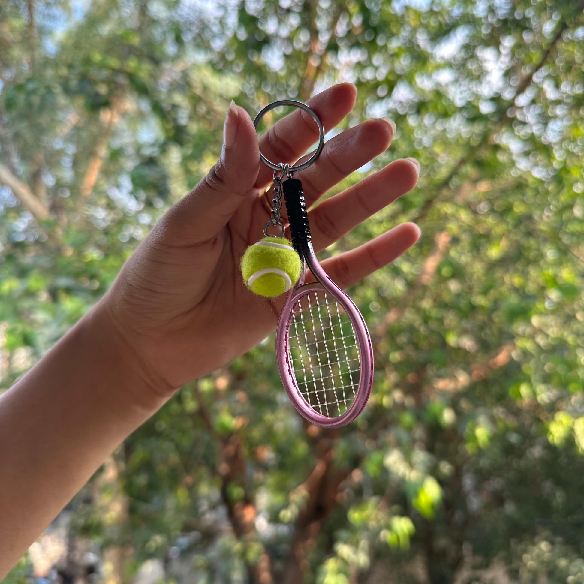 - Colour: Metallic pink racket with black handle and neon green tennis ball