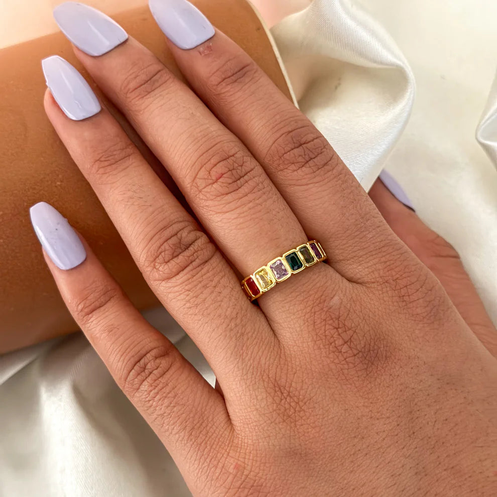 Radiant Stone-Studded Multi-Color Gold Band Ring – A bold, colorful ring that sparkles with personality