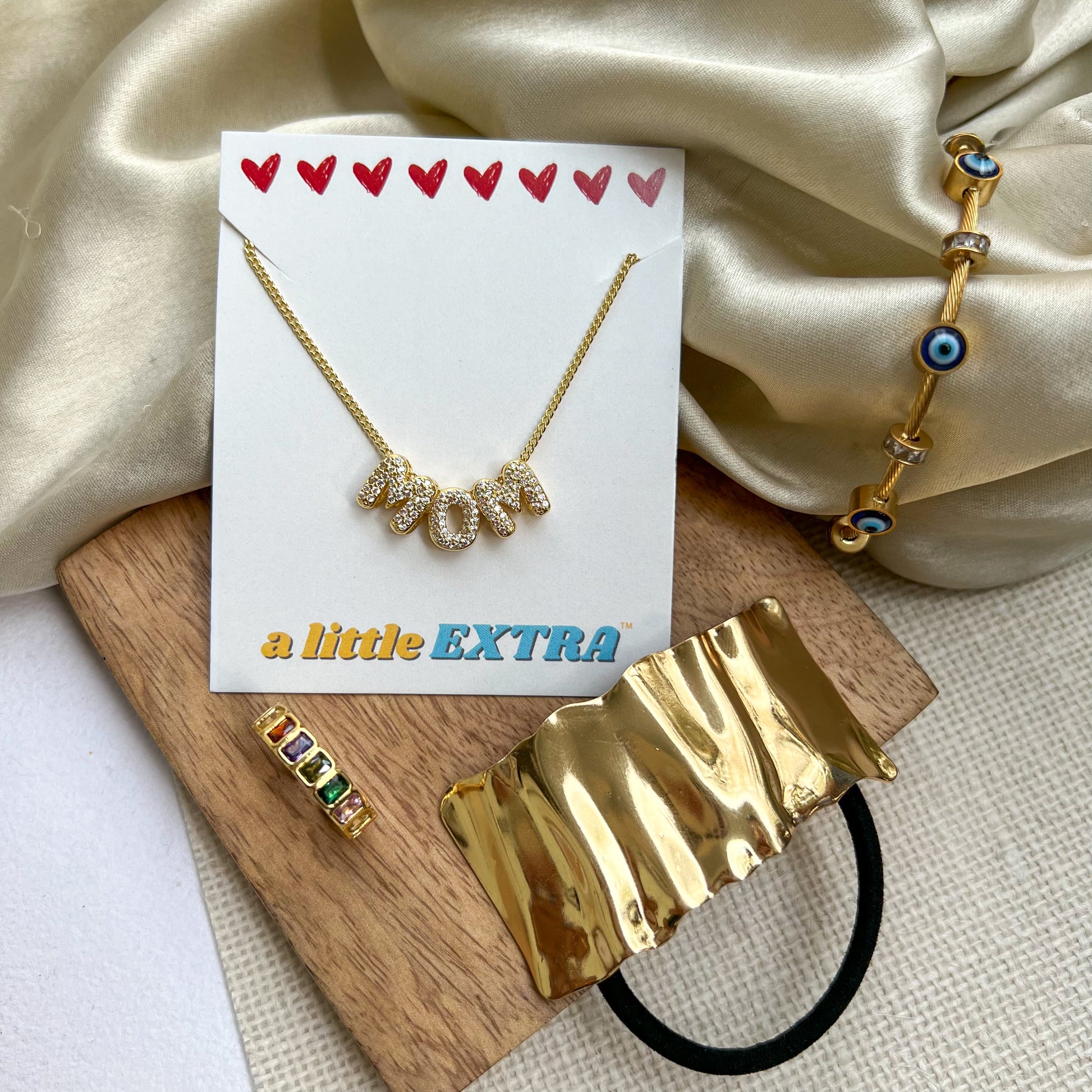 Mom Bubble 18K Necklace – A sleek, gold-plated necklace with a modern “Mom†bubble pendant