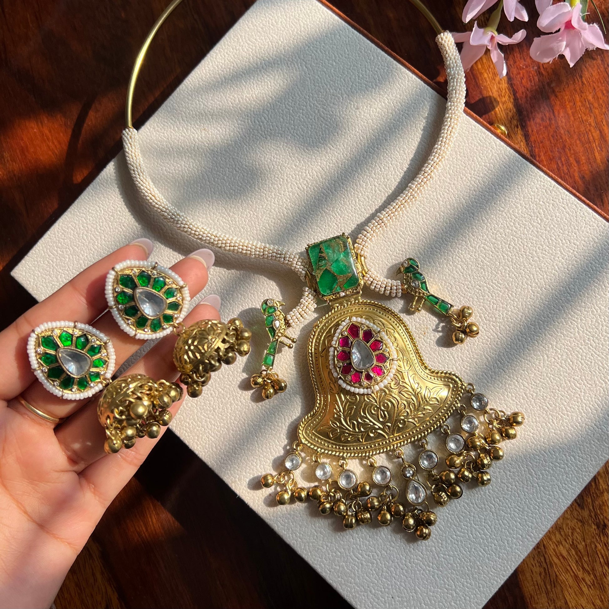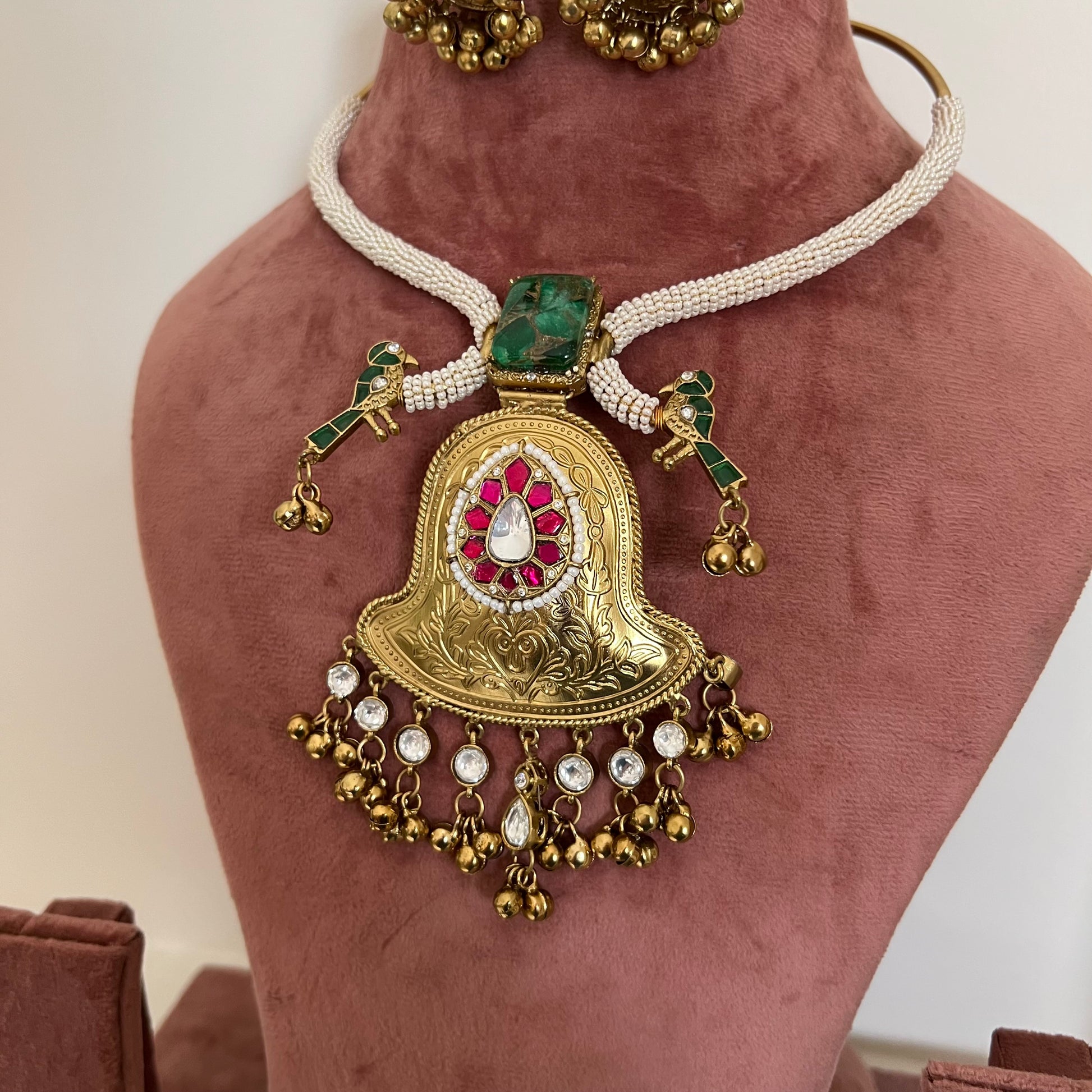 Features: This statement necklace set showcases a beautifully engraved gold-toned brass pendant adorned with moissanite stones, ruby-red and emerald-green enamel accents, and delicate hanging beads. The white beaded chain adds an elegant contrast, while the matching earrings with green enamel work and golden ghungroo drops complete the regal and heritage-inspired look.
