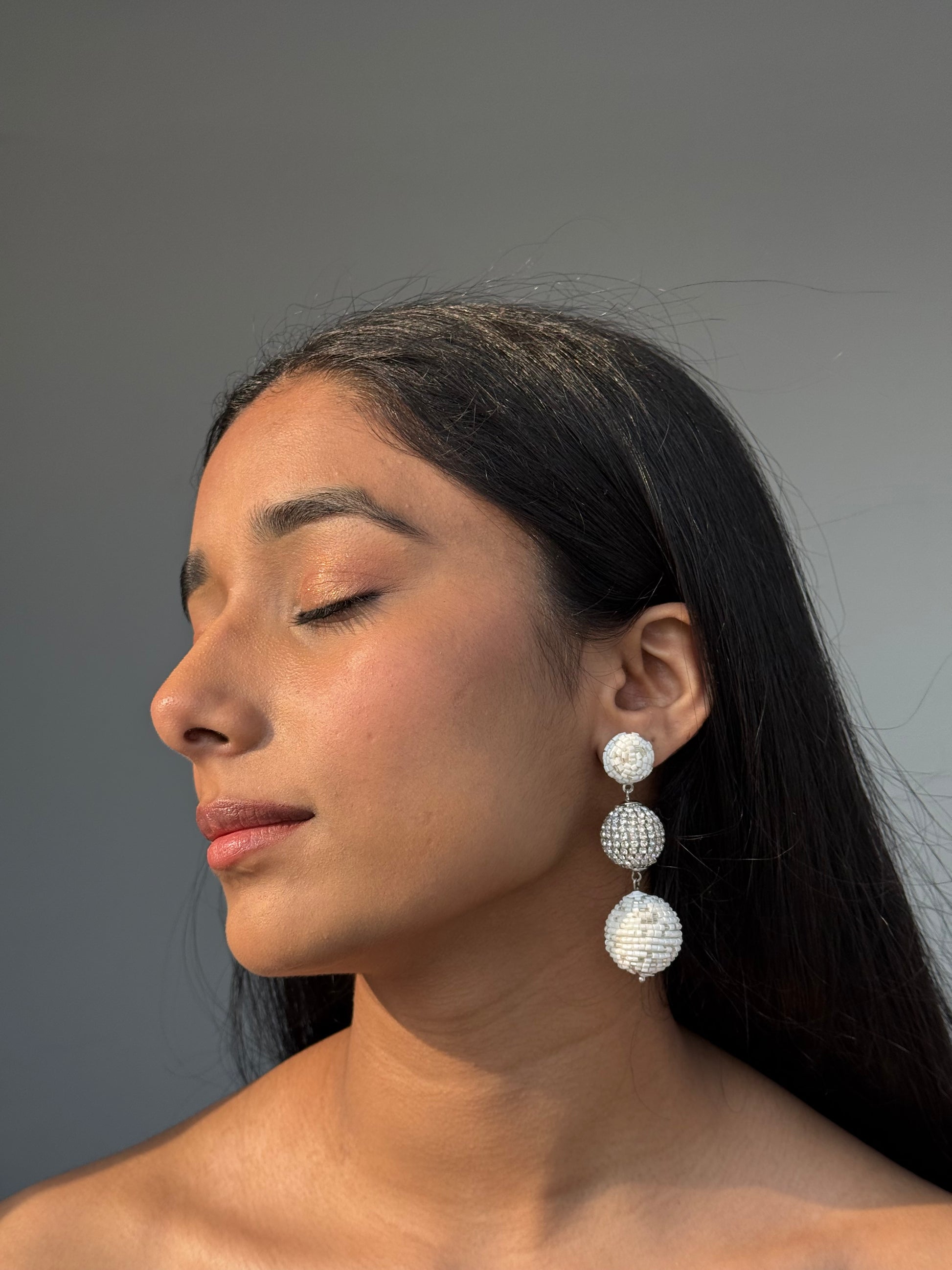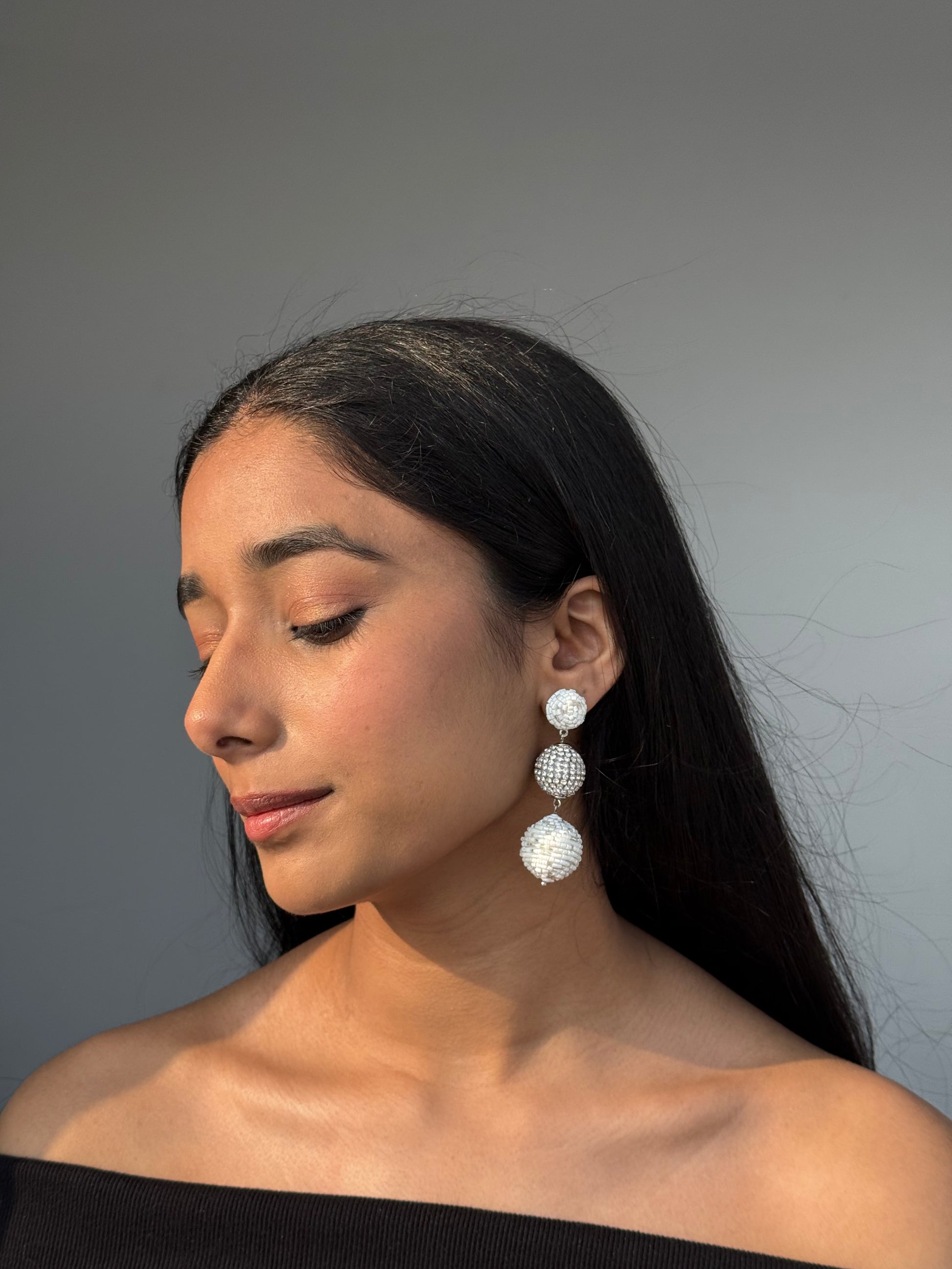 The Noor White Drop Earrings are a perfect example of craftsmanship and elegance, with cutdana detailing adding a traditional yet contemporary flair to this timeless design.