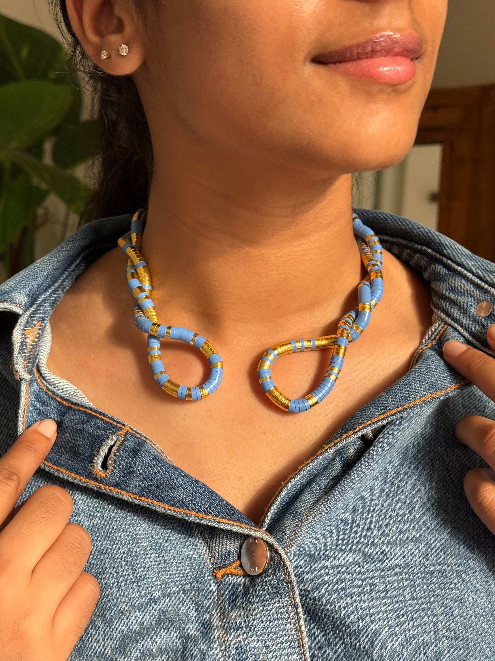 A striking mix of bold color and sculptural design, the Ocean Loop Necklace features turquoise-teal and silver-toned stacked beads knotted into a unique looped choker silhouette. Minimal yet statement-making, it’s the perfect piece to add a pop of color to neutral or monochrome fits.