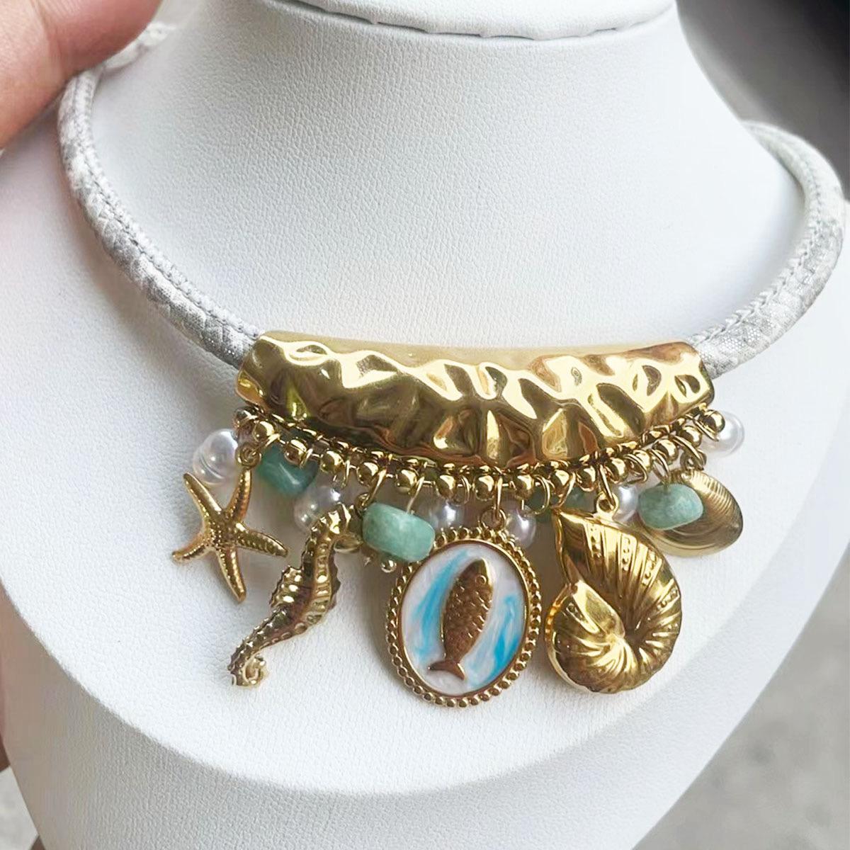Bring the sea to your style! This choker features a hammered gold centerpiece adorned with dangling sea-inspired charms — starfish, seahorse, shells, pearls, and aqua stones. Perfect for summer holidays, beach getaways, or simply when you want to channel effortless coastal chic.
