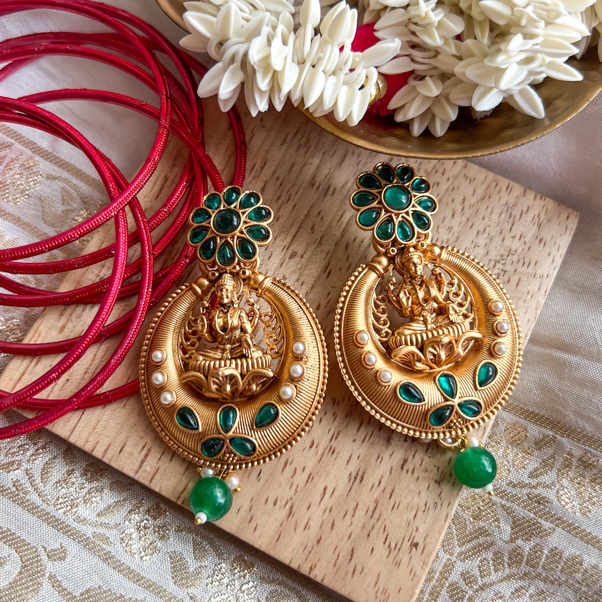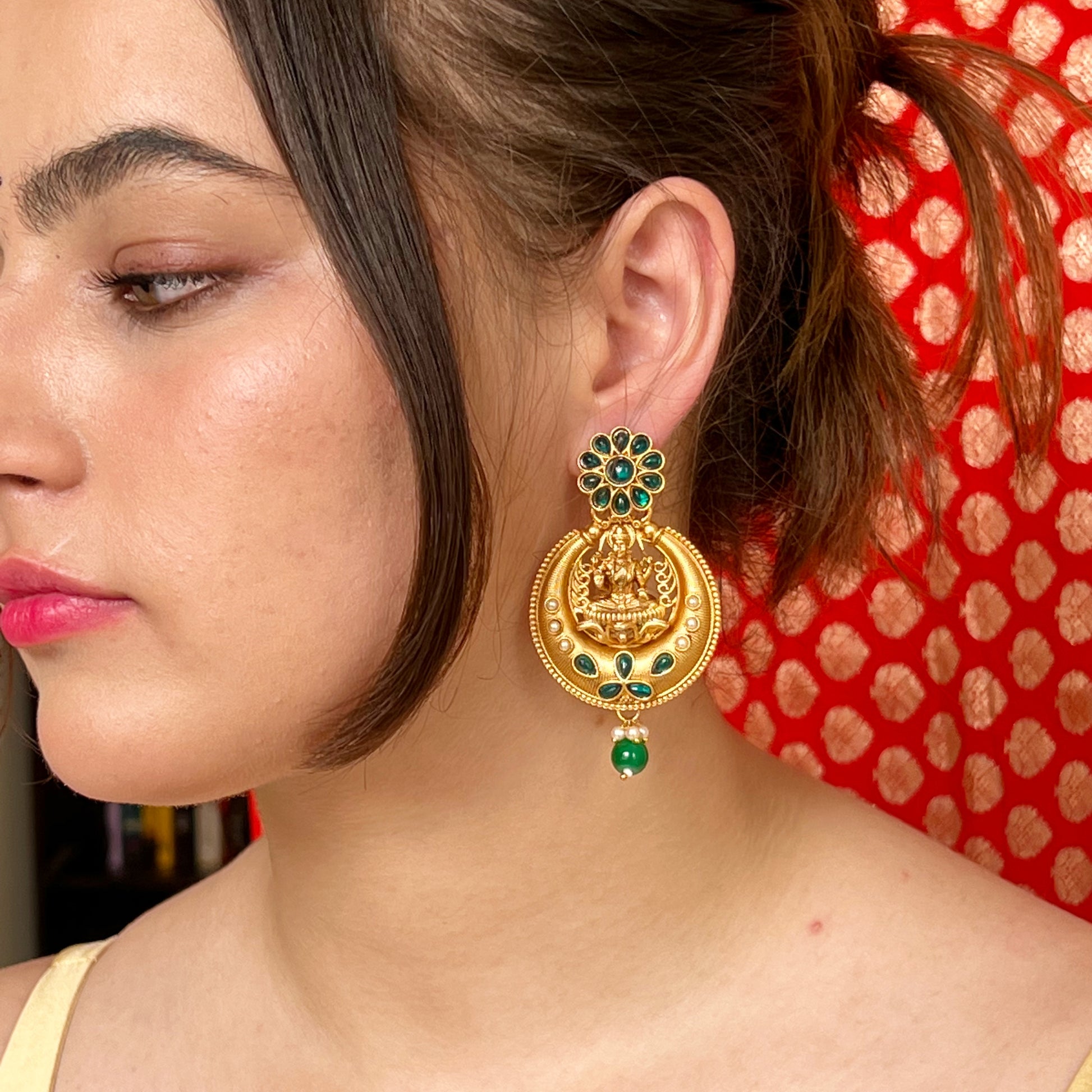 Introducing our Antique Ojasvi Temple Earrings in gold colour, adorned with green stones. These lightweight earrings feature a circular body and intricate temple design, offering a perfect blend of traditional elegance and modern affordability.
