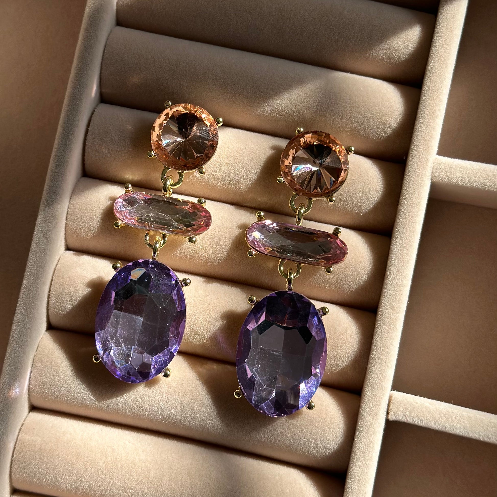 Style: Elegant multi-stone drop earrings featuring a tiered crystal design—romantic, feminine, and effortlessly chic