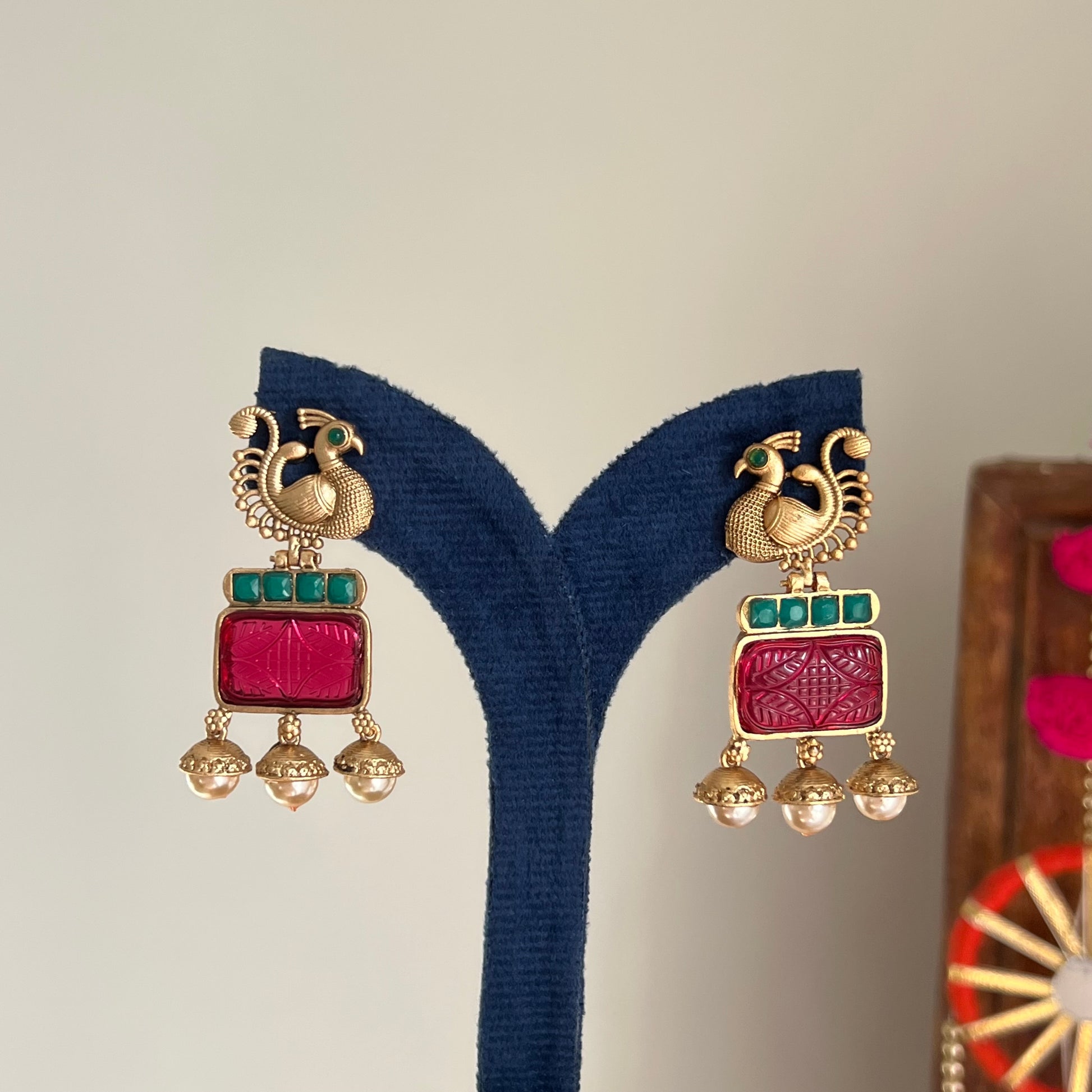 Celebrate timeless artistry with our Mayura Regal Drops. Crafted with a majestic peacock motif, these earrings are adorned with a carved ruby-red stone framed by vibrant green accents. The design is completed with delicate golden domes and pearl drops, blending heritage with elegance. A statement piece that embodies grace and royal charm.