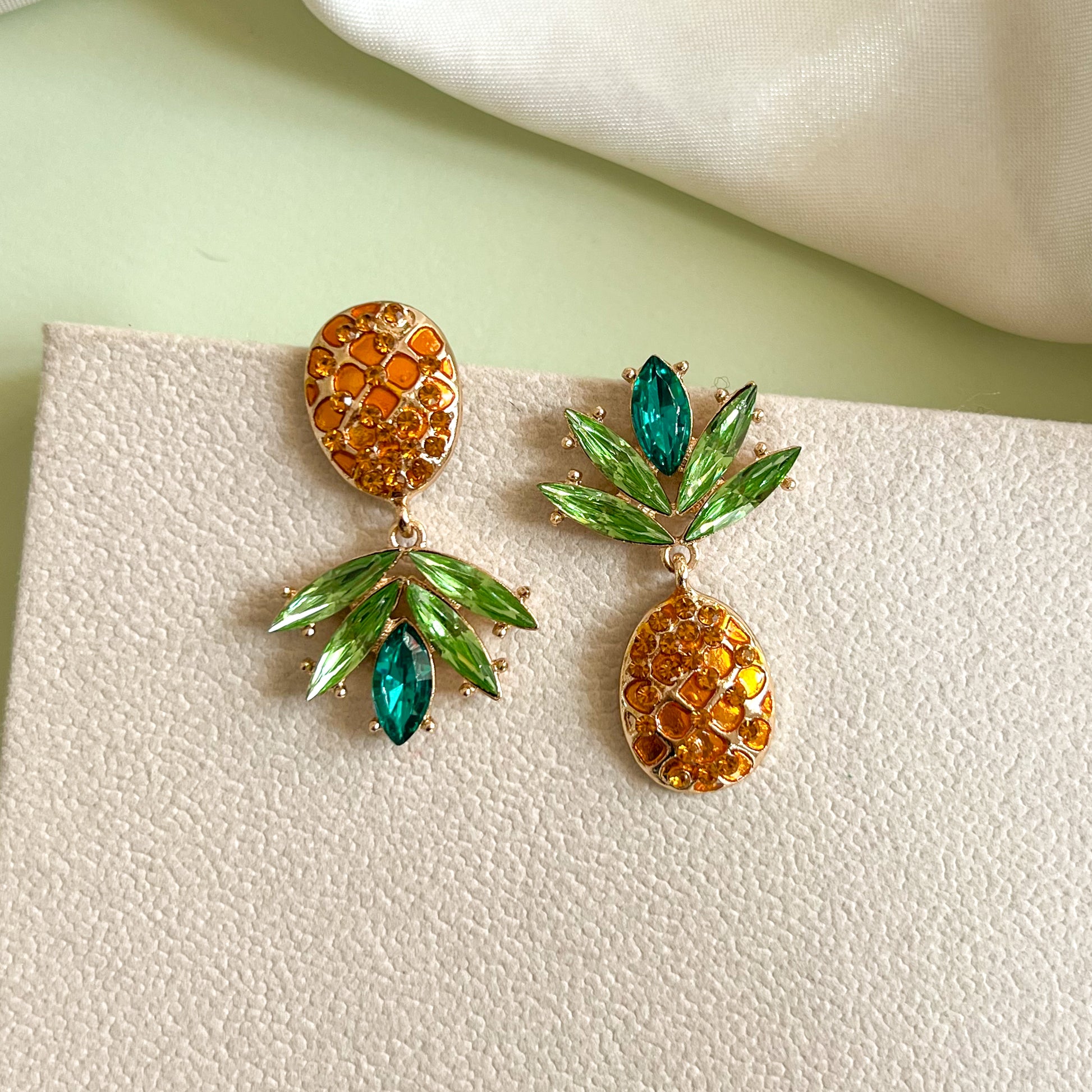 Style: Playful mismatched dangles — one earring flaunts a leafy crown above a golden crystal pineapple, while the other flips the design for a quirky, fashion-forward twist. A bold mix of tropical charm and modern glam.