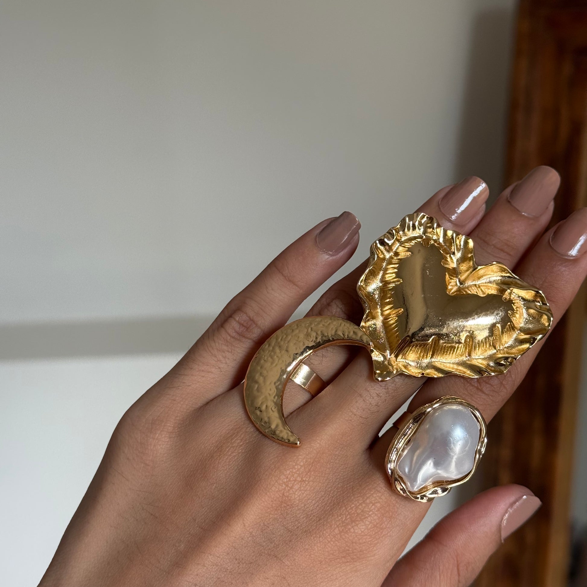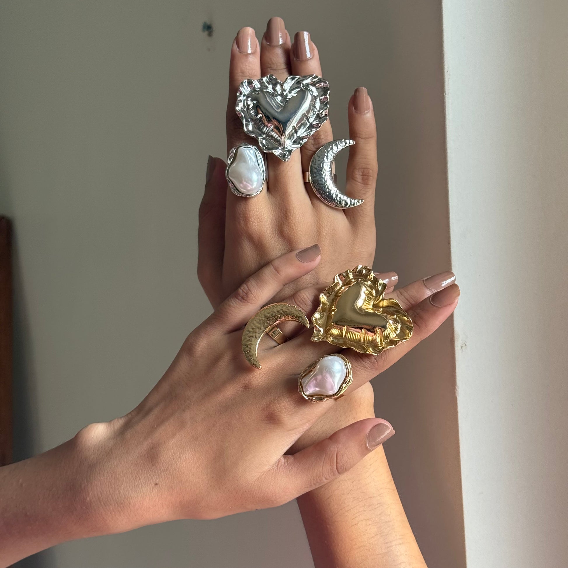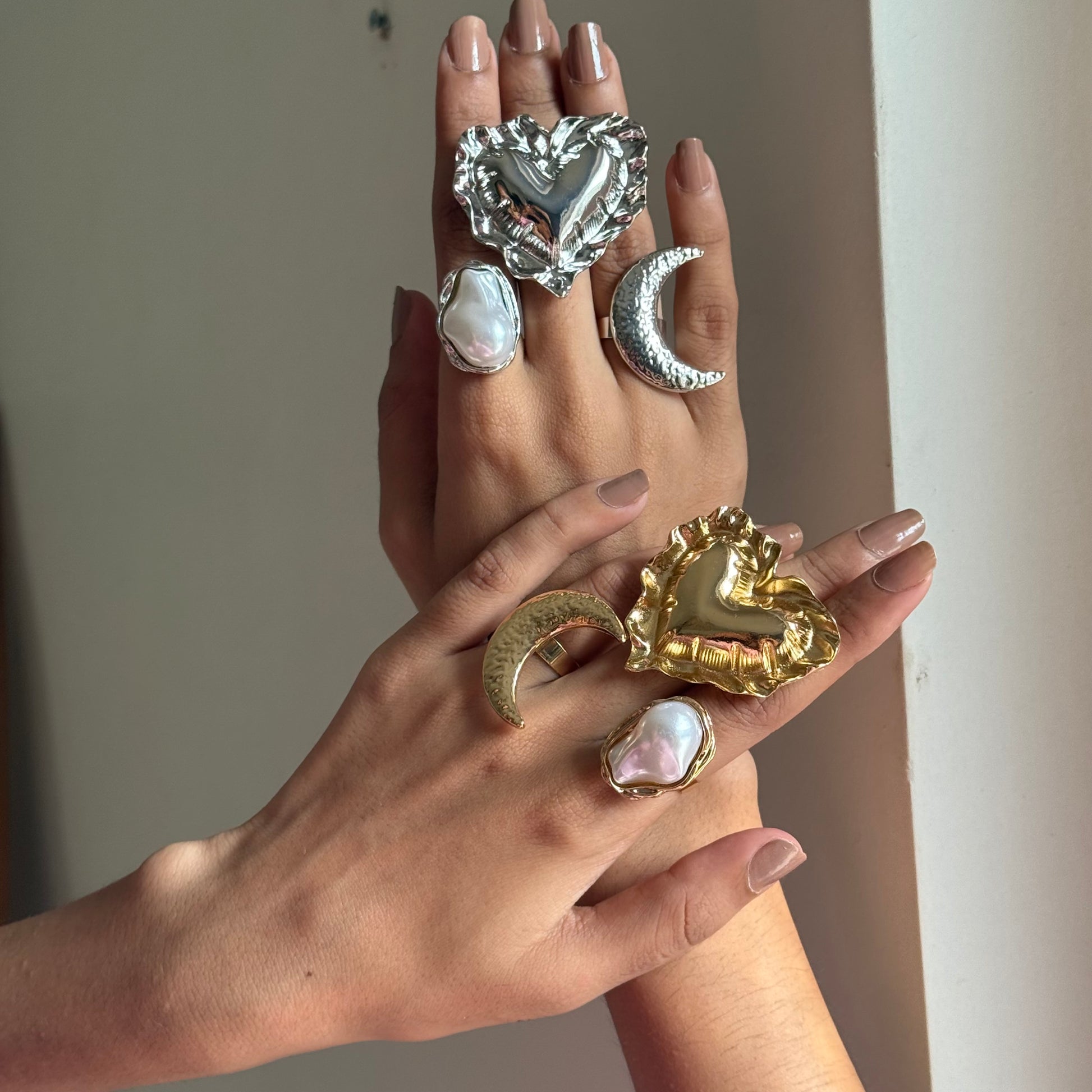 Style: Bold, sculptural, and celestial. Each ring is a conversation starter  featuring abstract heart shapes, crescent moons, and baroque-style pearls. Wear them solo for a refined edge or stack them for a maximalist moment.