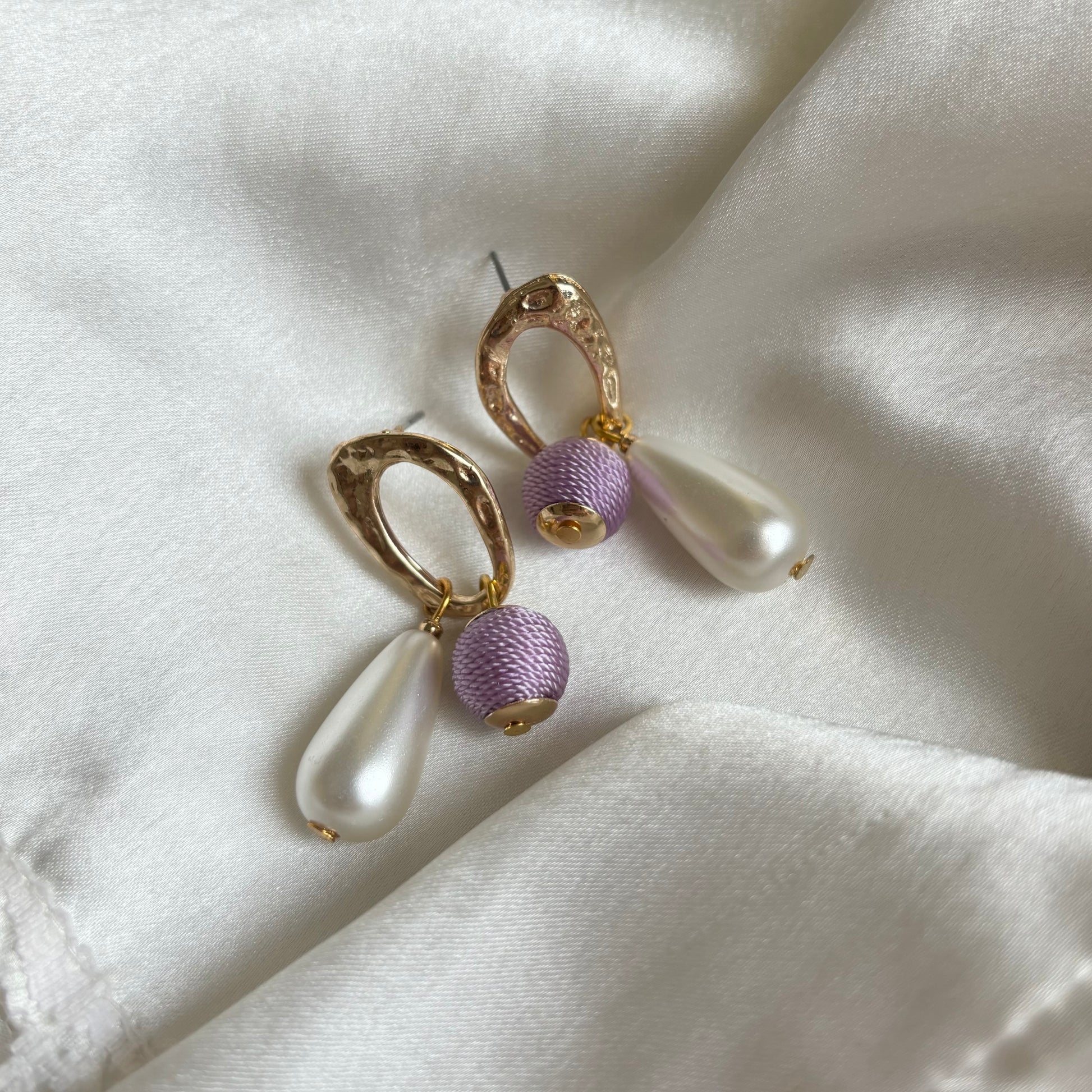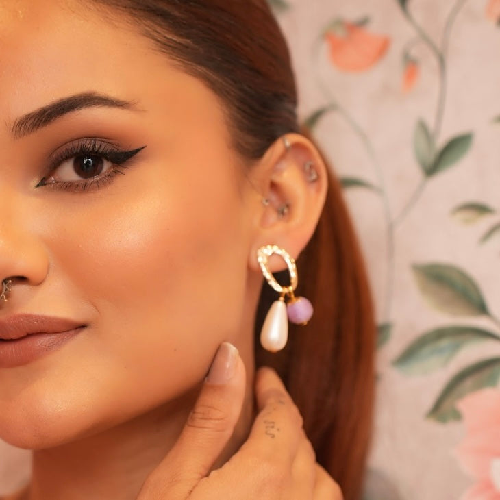 Features: Minimalist gold hoops adorned with a pastel lavender bead and a classic pearl drop.