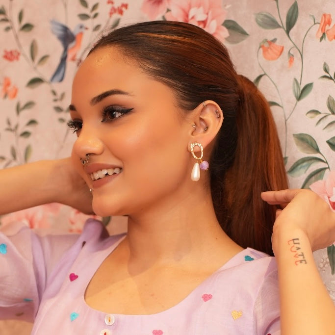 Saba Gold Earrings, a graceful fusion of gold-toned minimalism and soft, romantic detail. These delicate hoops are designed to turn heads subtly  featuring a chic lavender sphere paired with a lustrous teardrop pearl. Sleek, lightweight, and endlessly elegant  perfect for modern muses.
