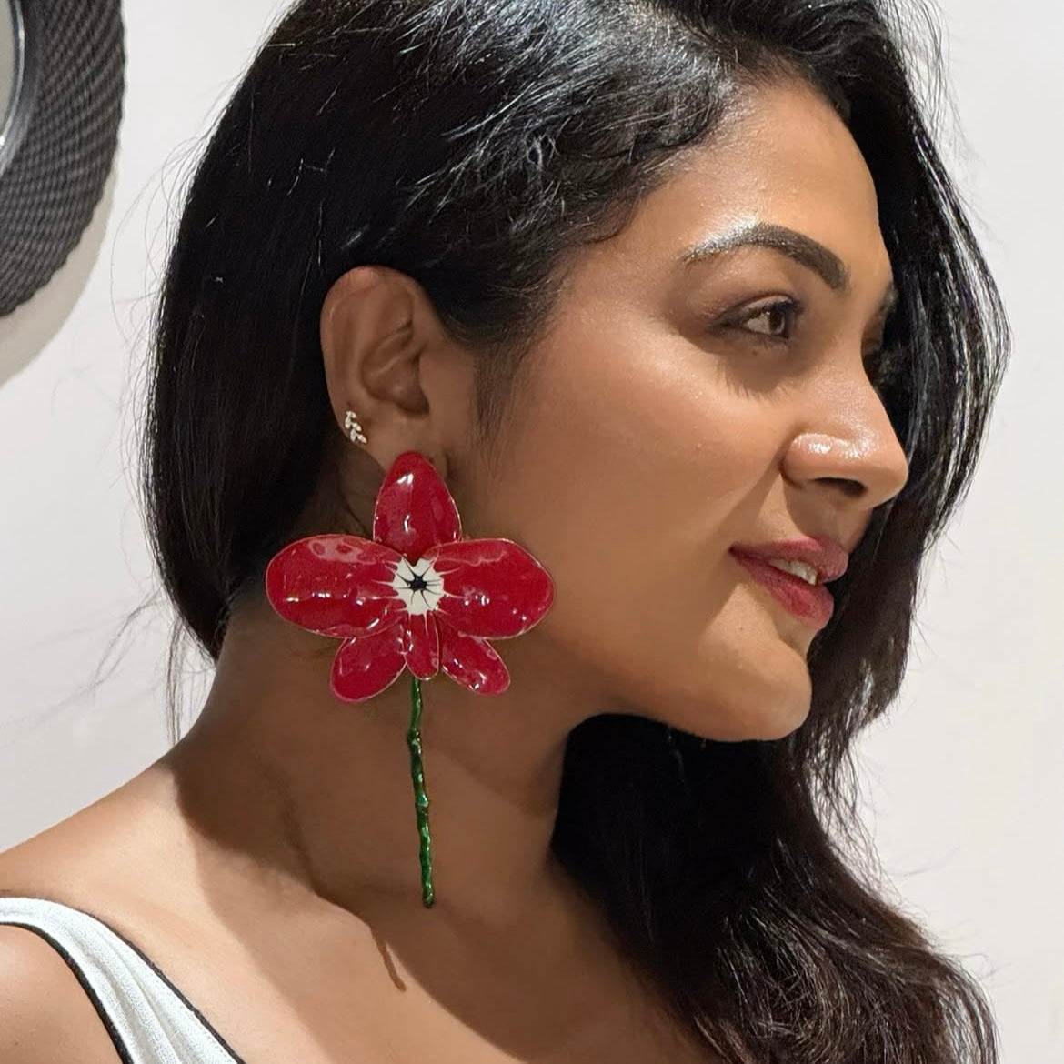 Turn every look into a statement with our Scarlet Bloom Earrings, inspired by the vibrancy of nature. Crafted in a striking oversized red flower design with a delicate green stem drop, these earrings are the perfect blend of playful artistry and bold elegance.