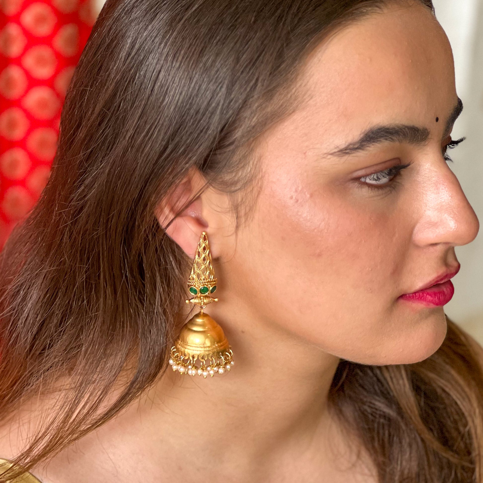 Embrace the divine elegance with Sugandha Green Temple Earrings. These traditional earrings are perfect for ethnic wear, adding a touch of uniqueness to your outfit. Crafted with intricate temple designs, they exude a timeless charm and elevate your style with their elegant appeal.