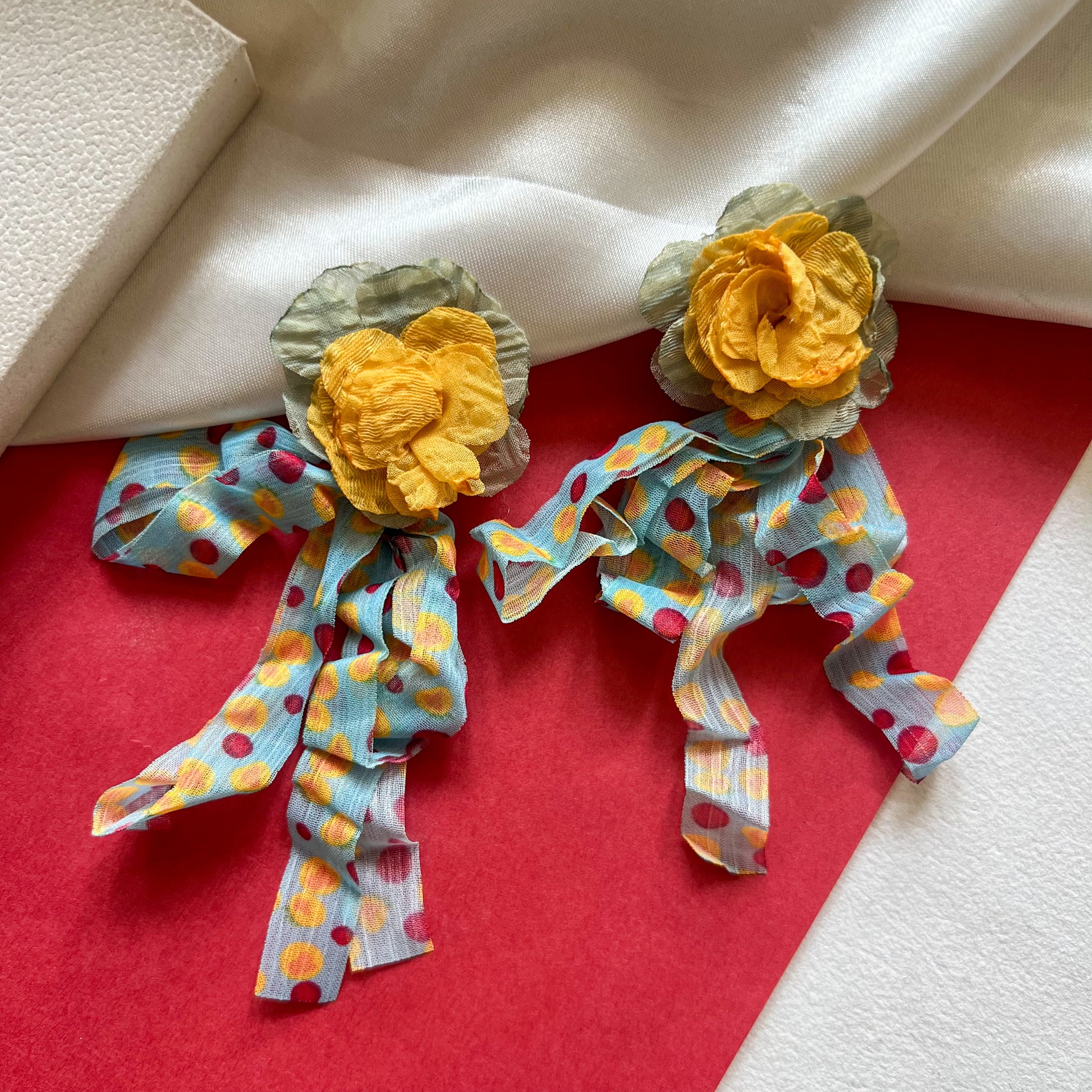 Turn heads with these sweet and cheerful fabric flower and ribbon earrings—a unique, charming accessory that channels a nostalgic, vintage garden party vibe.