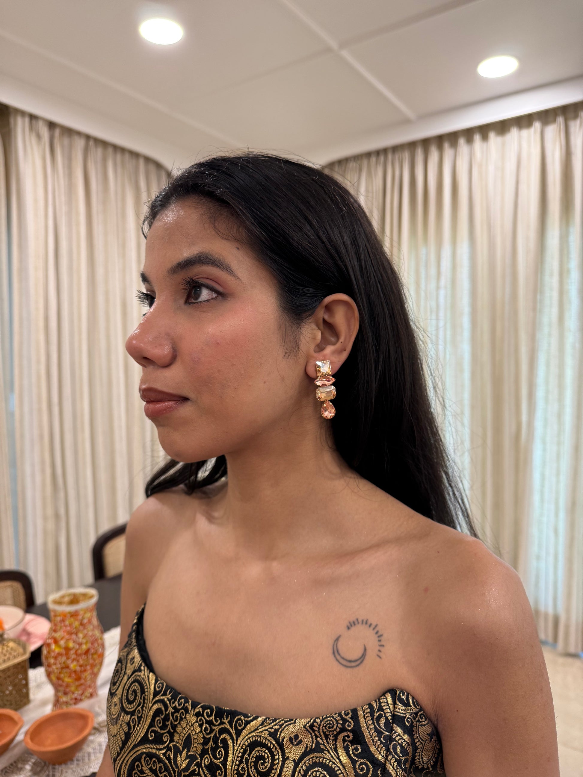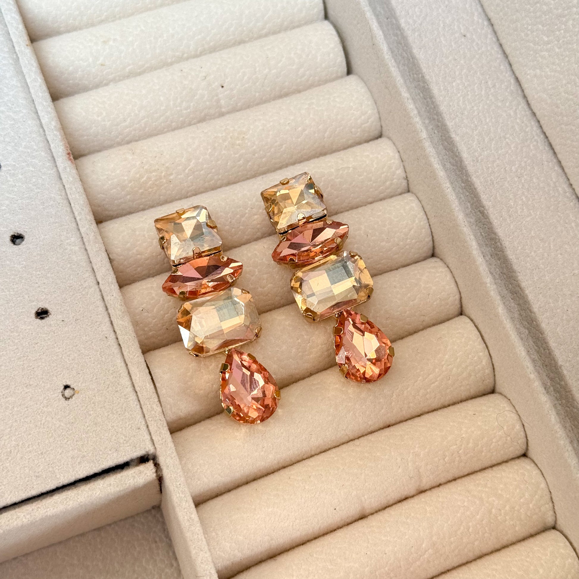 Style: Statement drop earrings crafted in a mixed cut design — combining square, marquise, rectangular, and teardrop stones in warm amber and golden hues.