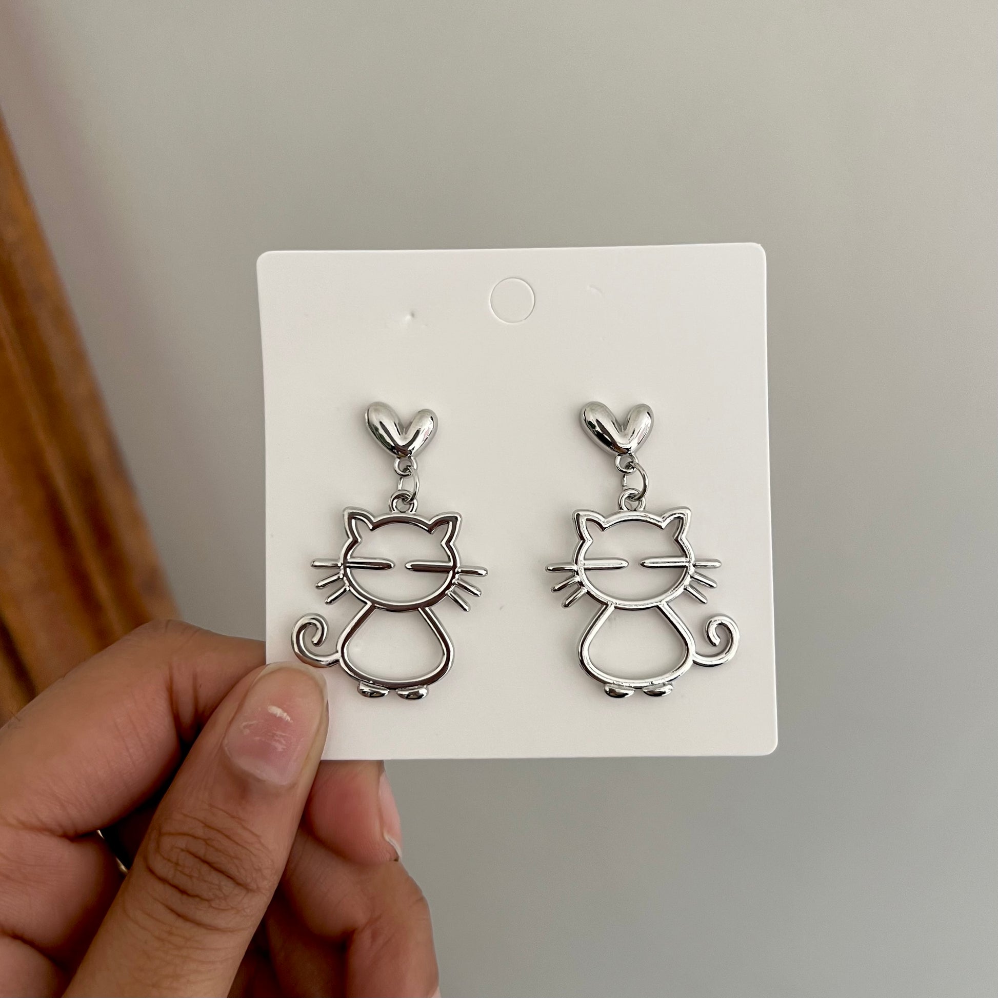 Turn heads with these charming and simple silver cat dangle earrings—a sweet accessory perfect for expressing your love of felines with a minimalist, casual style.