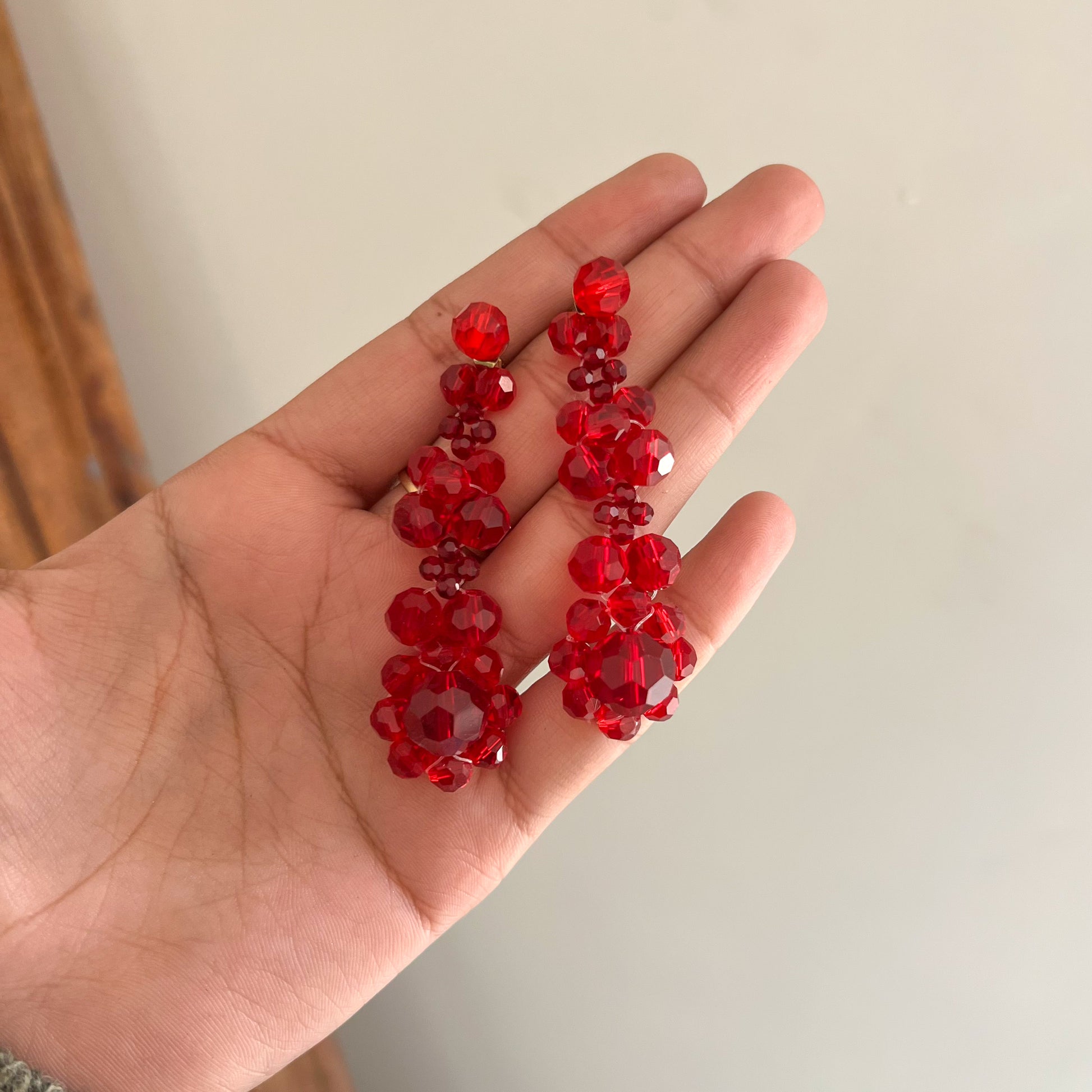 Design Focus: Features multiple clusters of round and facet-cut ruby-red crystals wired together, creating a beautiful, full, and textured drop that catches the light spectacularly.
