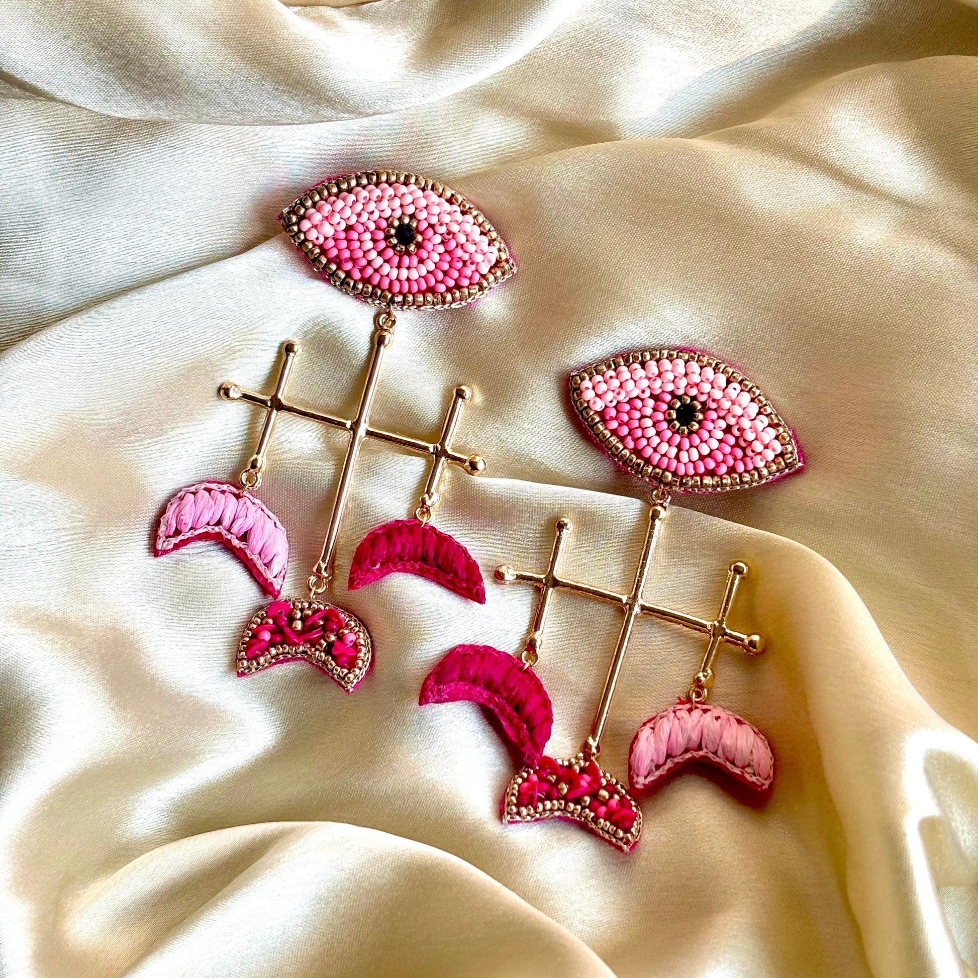 Third Eye Handmade Beaded Earrings, where celestial beauty meets ancient symbolism. These striking earrings feature a mesmerizing pink-hued evil eye at the center, believed to ward off negative energy while exuding a powerful sense of mystique. Suspended from a sleek golden rod, three graceful crescent moons add a touch of lunar magic, creating a statement piece that blends bold design with spiritual charm.