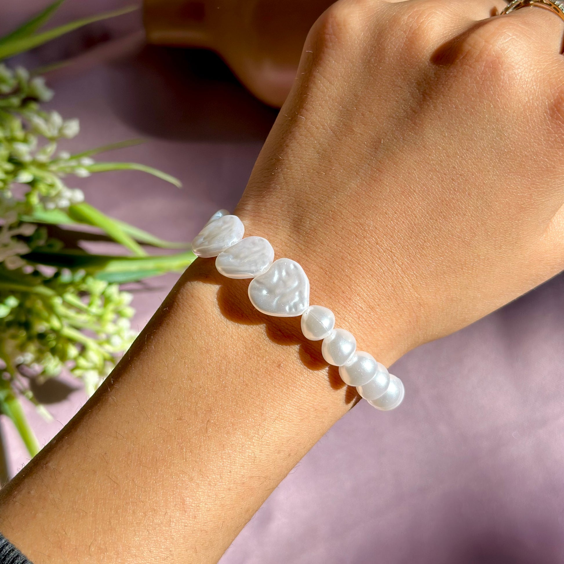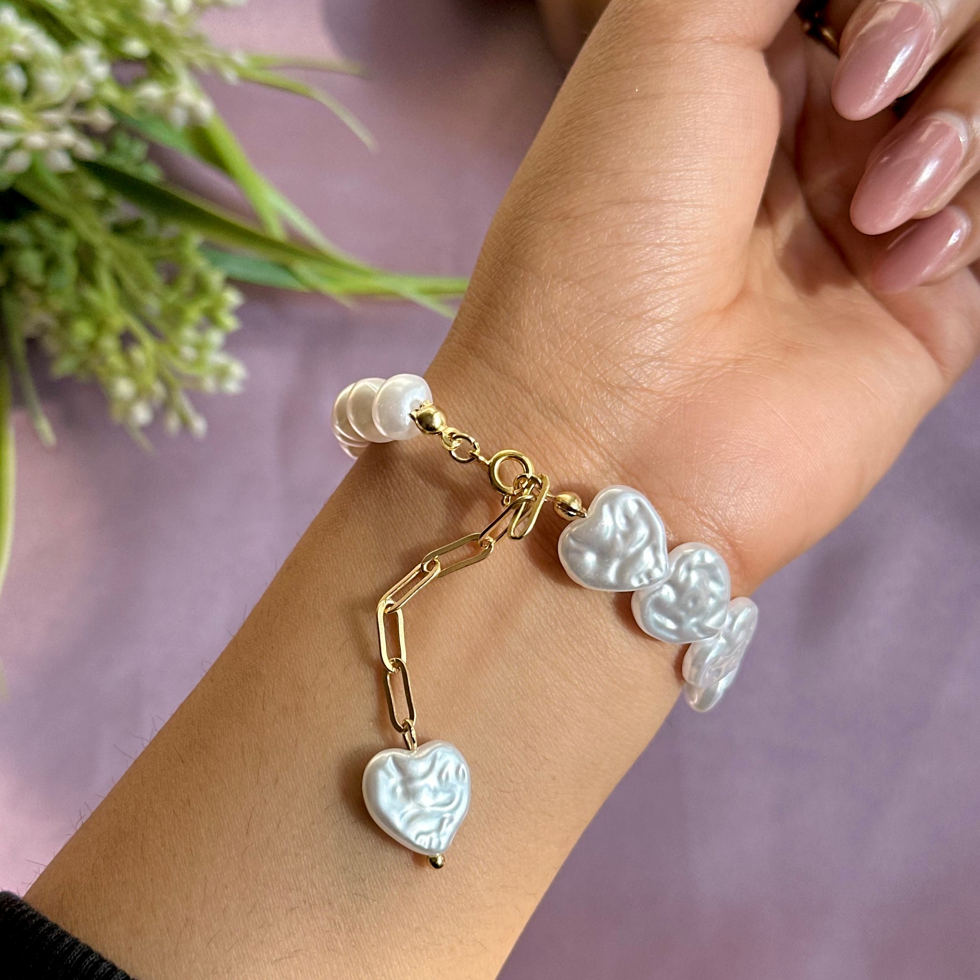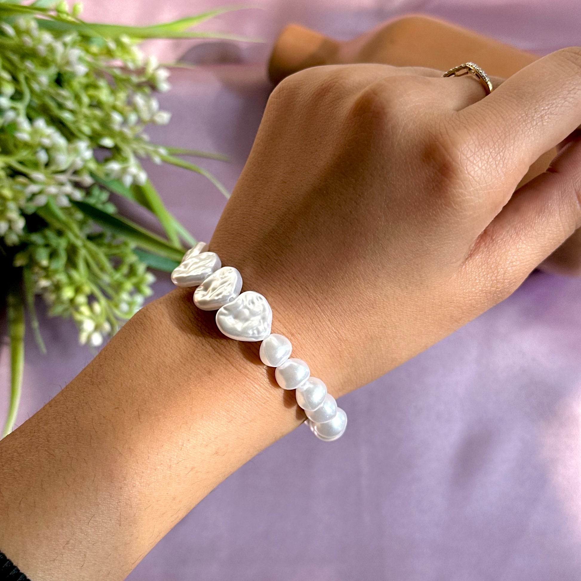Victoria White Pearl Bracelet, a delicate blend of classic charm and modern elegance. Featuring a mix of white circular pearls and heart-shaped pearls, this bracelet is designed to turn heads with its soft luster and romantic detail perfect for elevating any look, from casual chic to graceful glam.