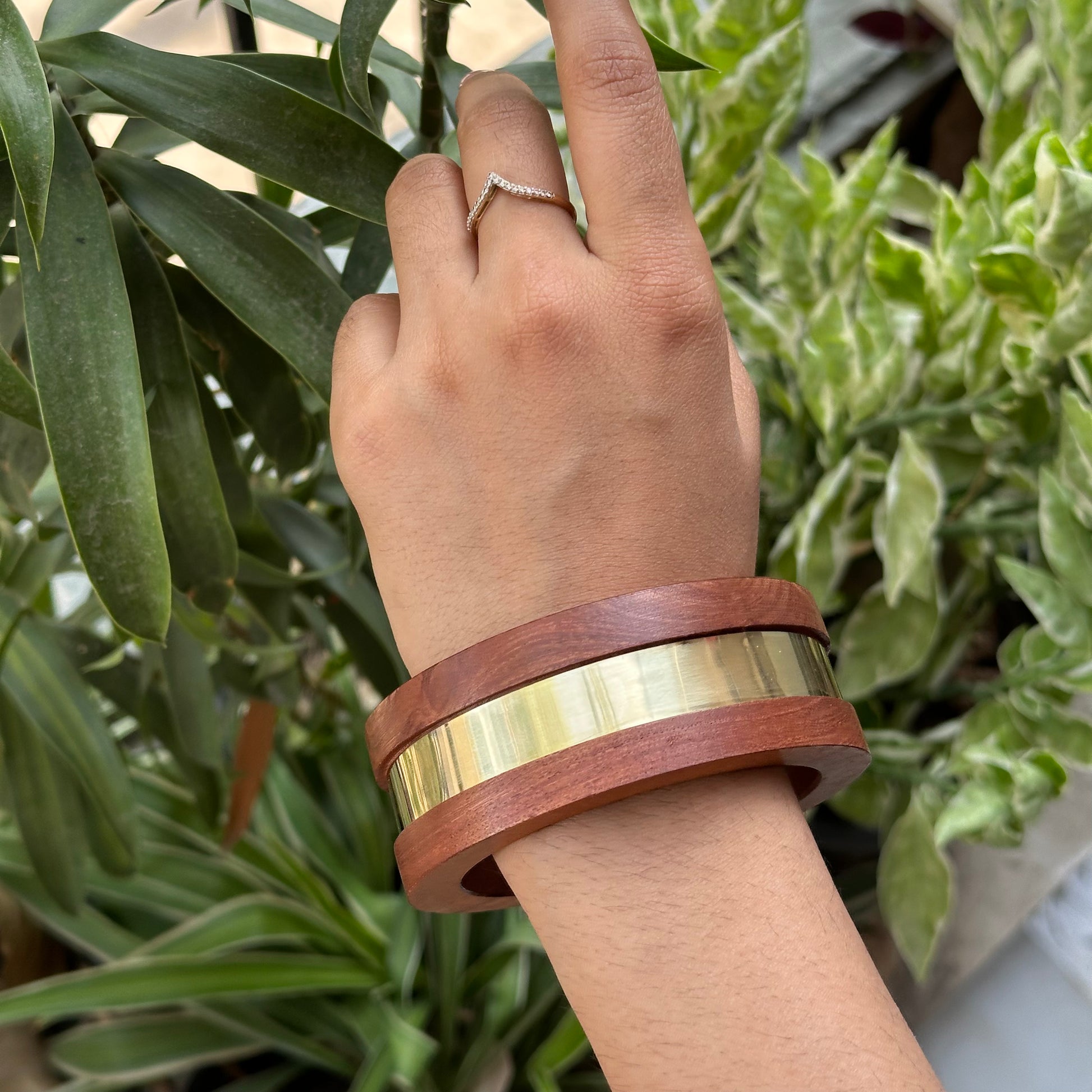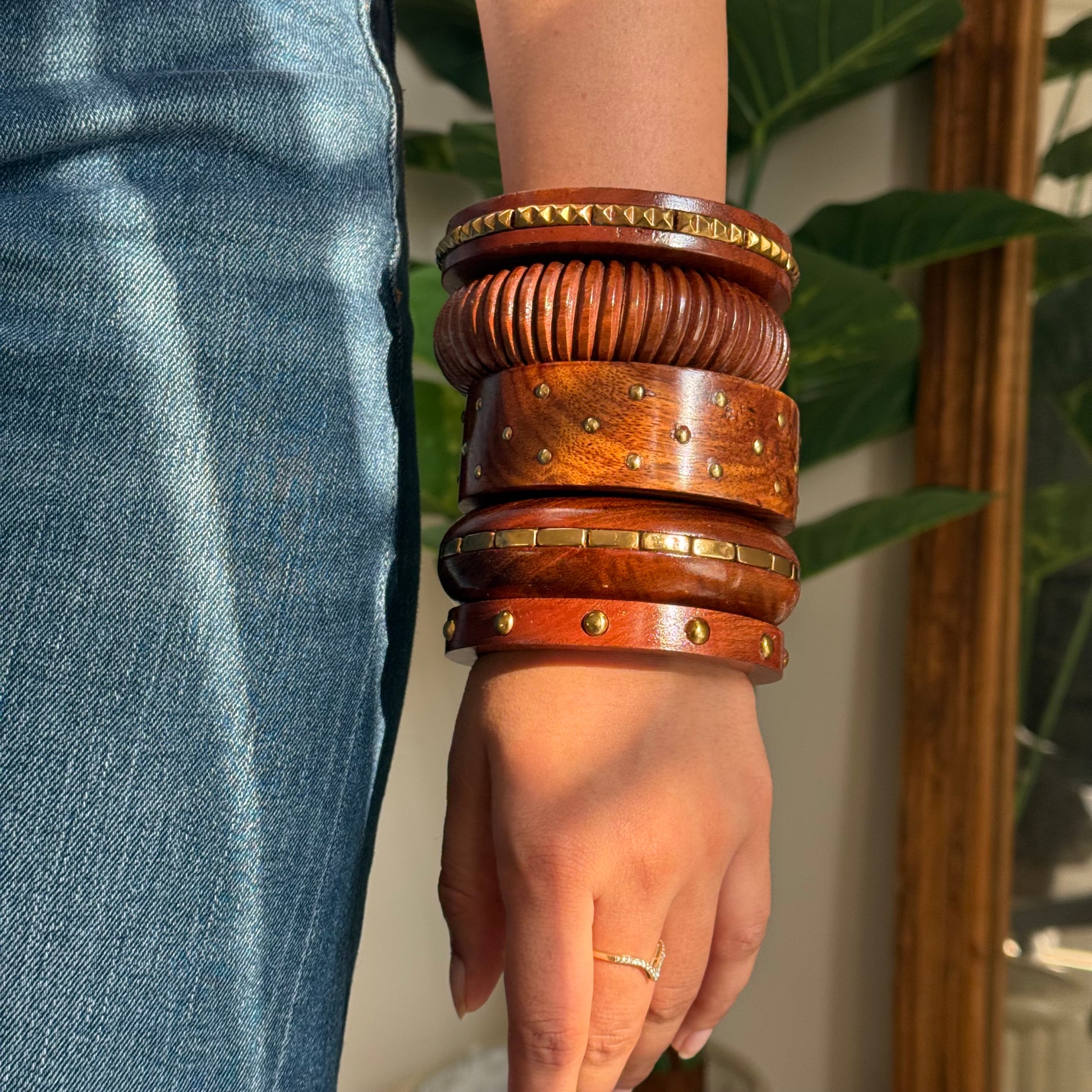 Rooted in tradition and styled for today, these Wooden Bangle Set is handcrafted from richly grained Keekar wood known for its strength, durability, and warm, natural finish. There are 10 designs each with its own unique design and subtle brass detailing. Whether worn together or separately, these bangles offer a grounded, artisanal touch to any look.